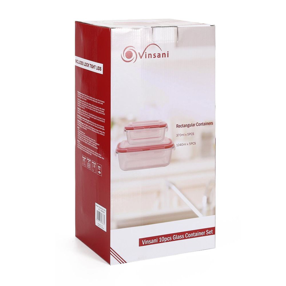 DIMENSIONS: Total 10 piece Set - 5 x 370ml containers - size - L15.4 x W11.5 x H6.5 cm, 5 X 1040ml containers - size - L20.3 x W15.4 x H7.7 cm