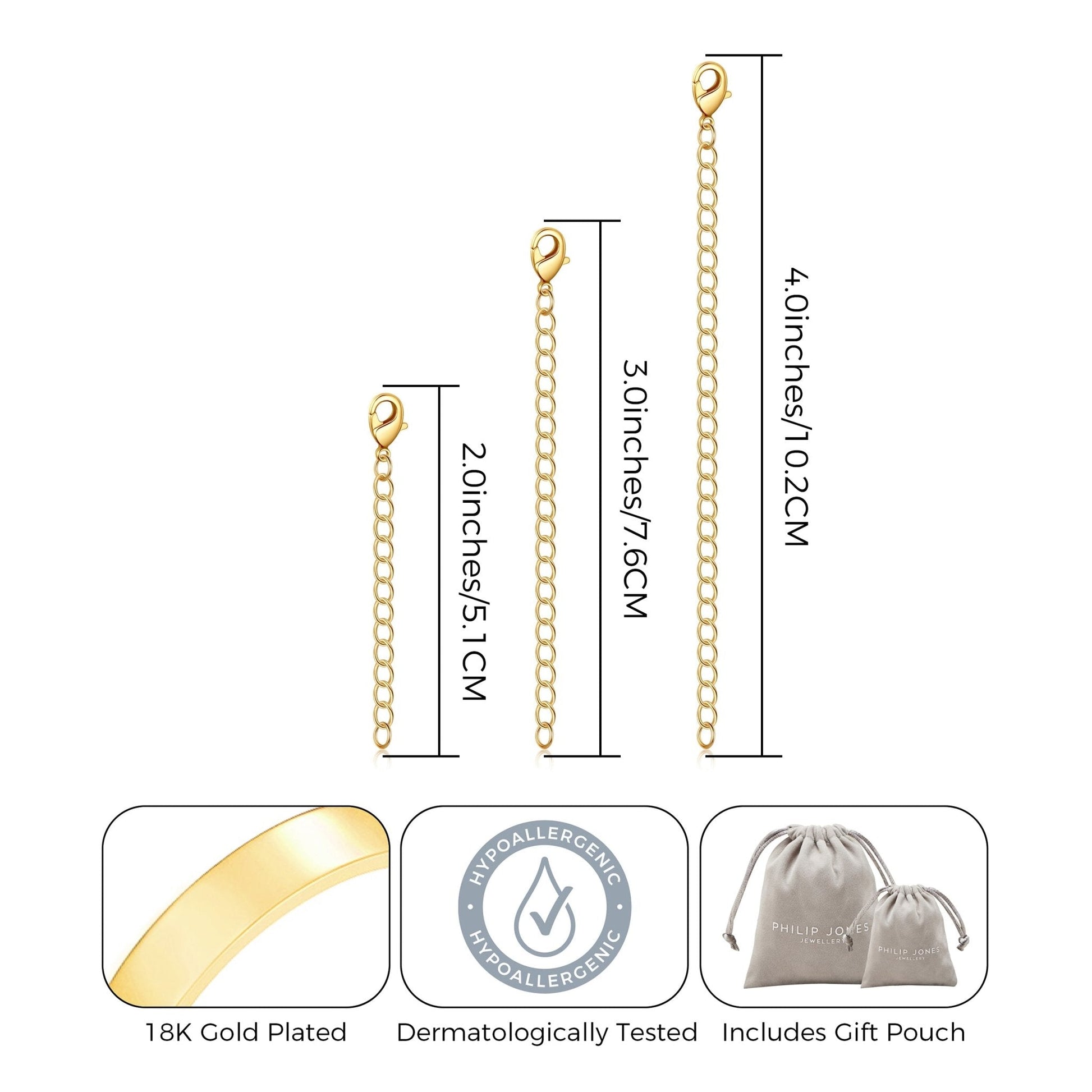 Enhance your jewellery with this 3-pack of gold plated chain extenders in 2", 3", and 4" lengths. These hypoallergenic cable chains feature secure lobster claw clasps for reliable wear. Each pack arrives in a stylish gift pouch measuring, making them perfect for adding versatility and comfort to your necklaces or bracelets.