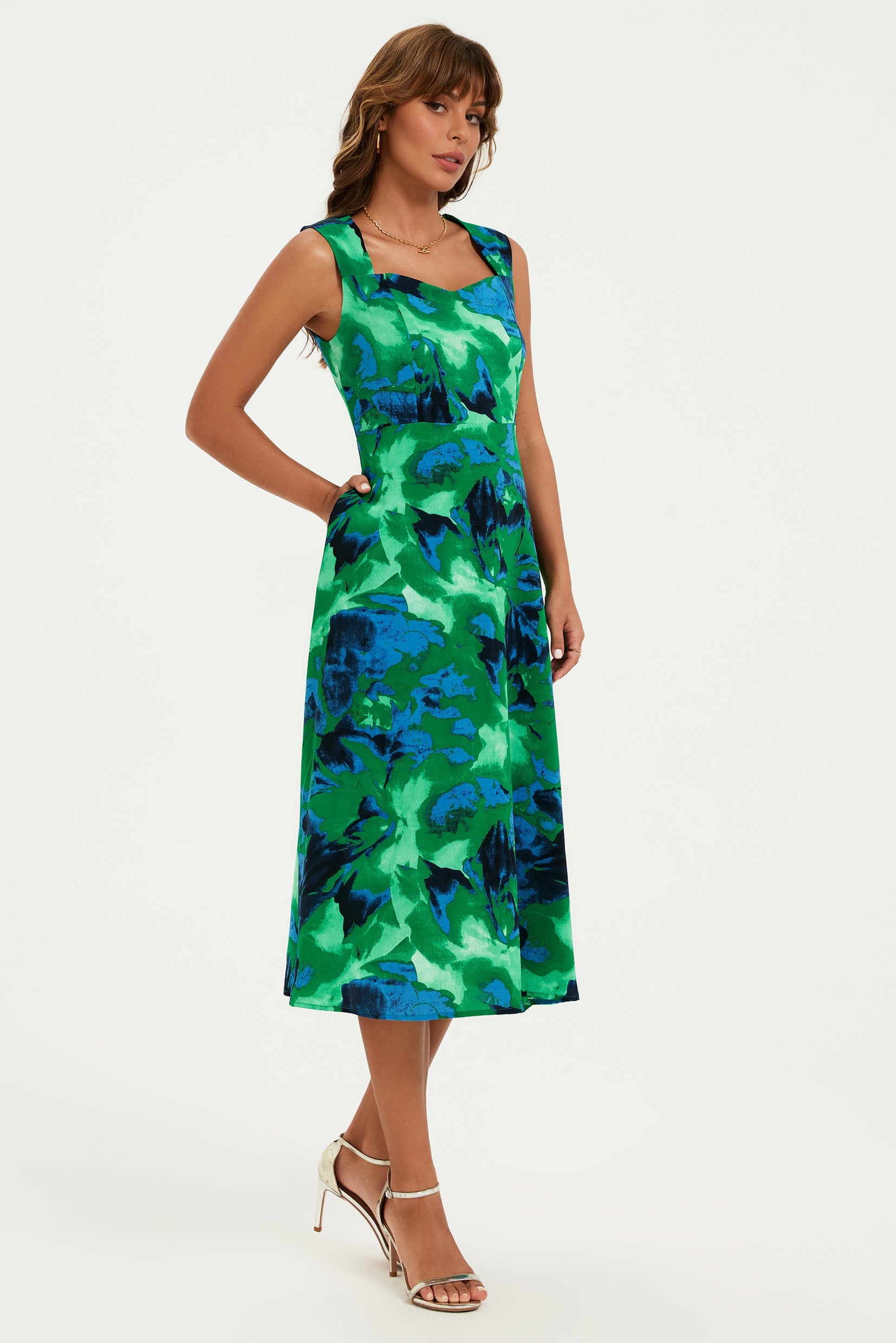 Make a statement in this eye-catching floral midi dress. Crafted from a structured fabric, this sleeveless design features a bold watercolour print in vibrant green and blue hues, perfect for adding a pop of colour to your wardrobe. The sweetheart neckline and fitted bodice create a flattering silhouette, while the A-line skirt falls gracefully to mid-calf for a timeless finish. Pair with heels or boots for an effortless day-to-night look.