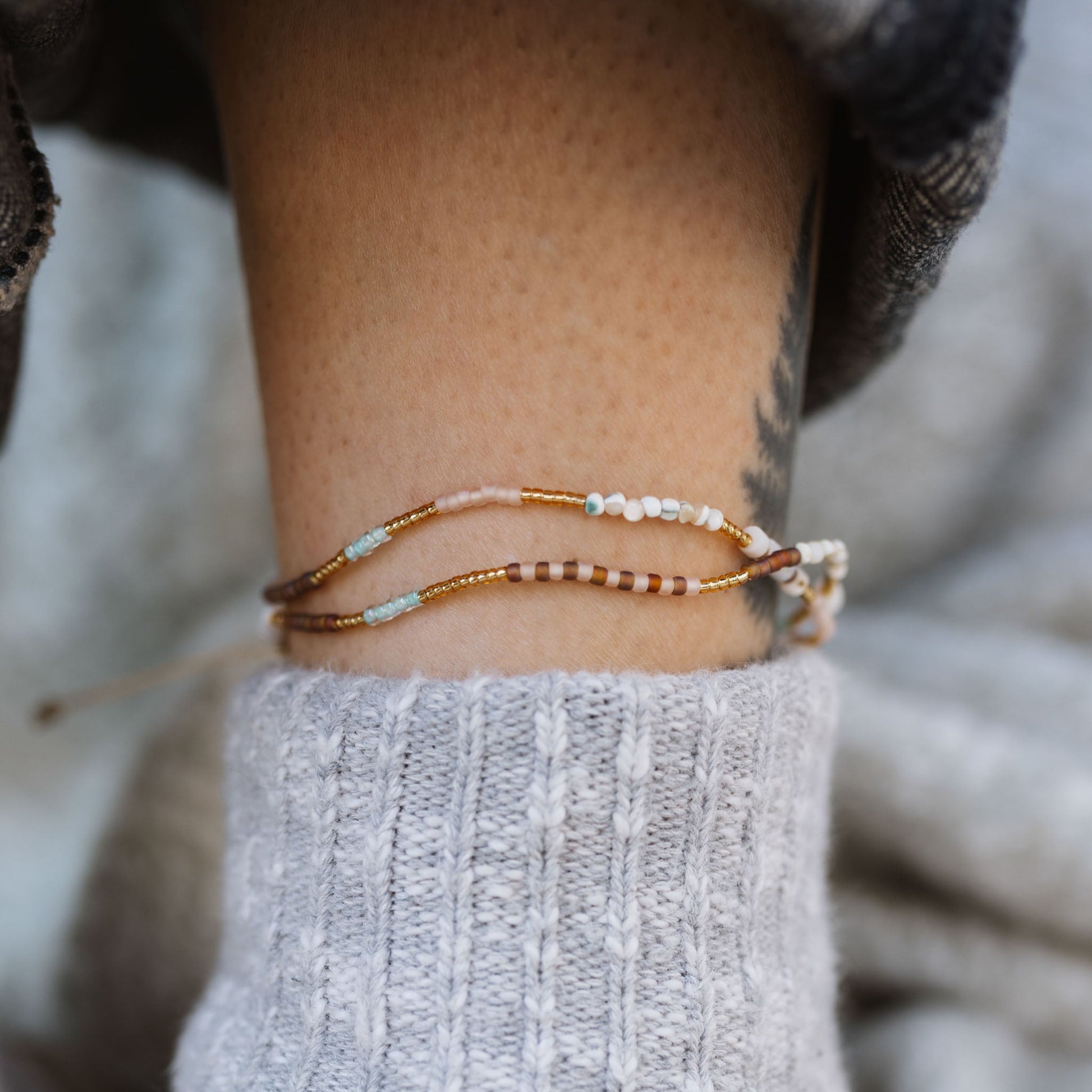 ‘Alam’ means nature in Indonesian, and this anklet brings all those laid-back, earthy tones together. Made with an adjustable wax polyester sliding knot closure for an easy, comfy fit, it features a mix of neutral tones with beautiful golden accents, finished with shimmering troca shell.
