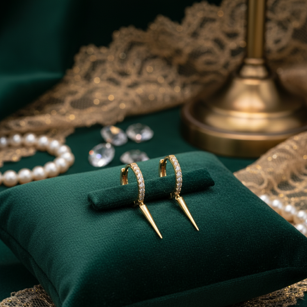 Turn heads with our Gold Spike Huggie Hoop Earrings, the perfect fusion of dainty sparkle and daring edge. Crafted from high-quality gold-plated sterling silver and encrusted with brilliant cubic zirconia stones, these hoops feature a sleek spike drop that adds just the right amount of attitude to your everyday or evening look.