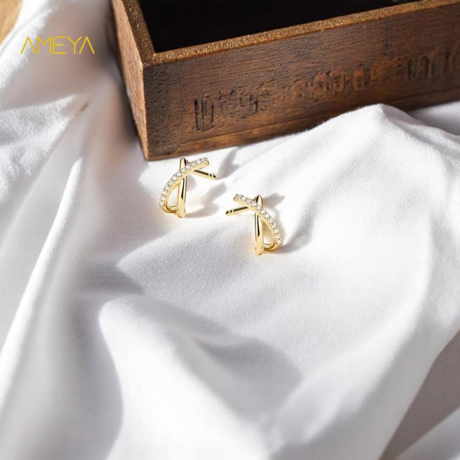 Ameya Gold Plated Cross Knot Stud Earrings, 925 Sterling Silver, Designer Crystal