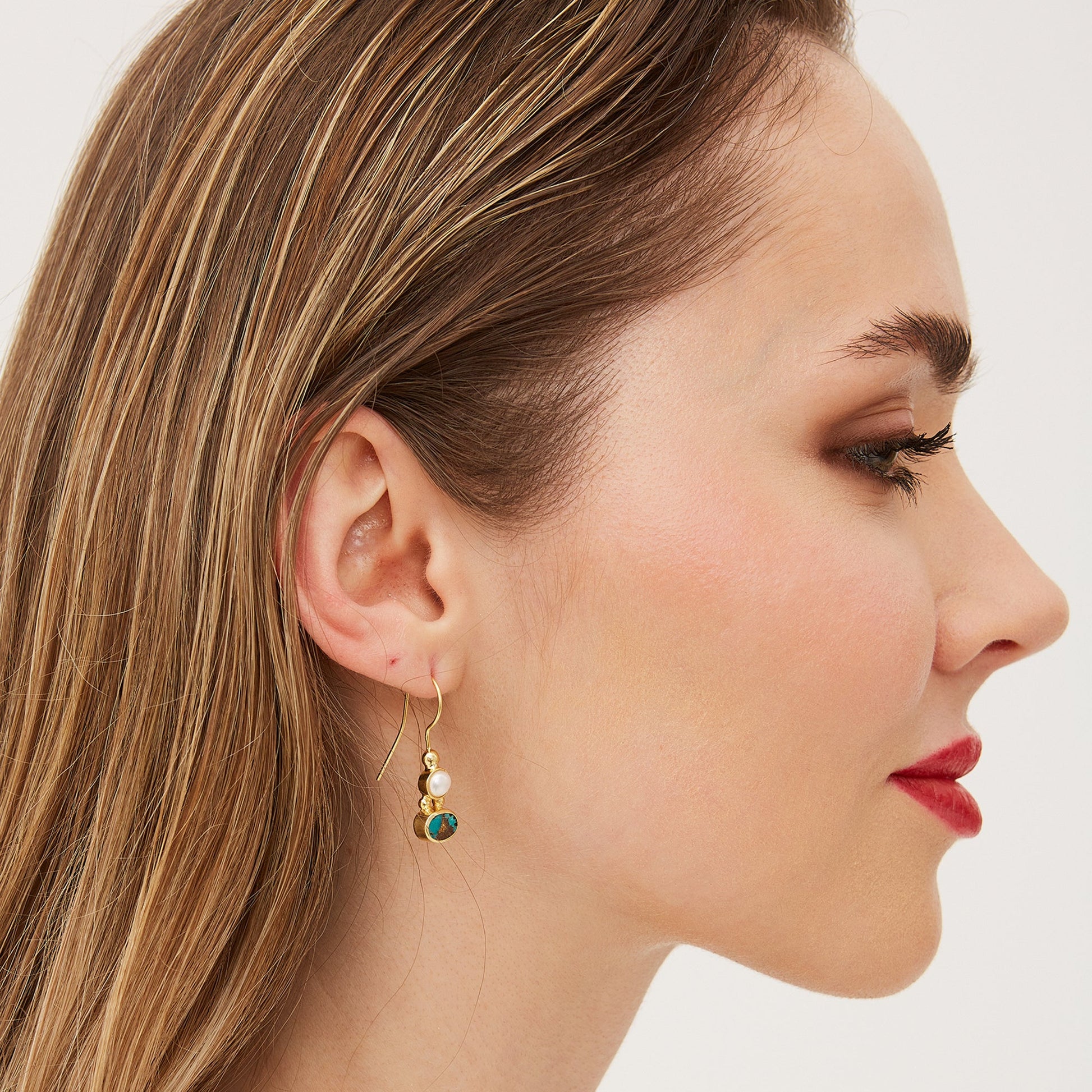 Time to take on the day by wearing this stunning yet classic pair of Turquoise Drop Earrings. Fashioned in a 925 recycled sterling silver, it showcases a dangle drop design embellished with turquoise and white stone finished with a gold-plated, adding a luxurious touch to your look. It has a fish hook closure for a secure wear and take-off experience. These earrings are available in luxe gold and silver tones, so select your favorite one to pair with your statement accessories. Wear this pair alone and stack them with other delicate earrings for an elegant and coordinated look.