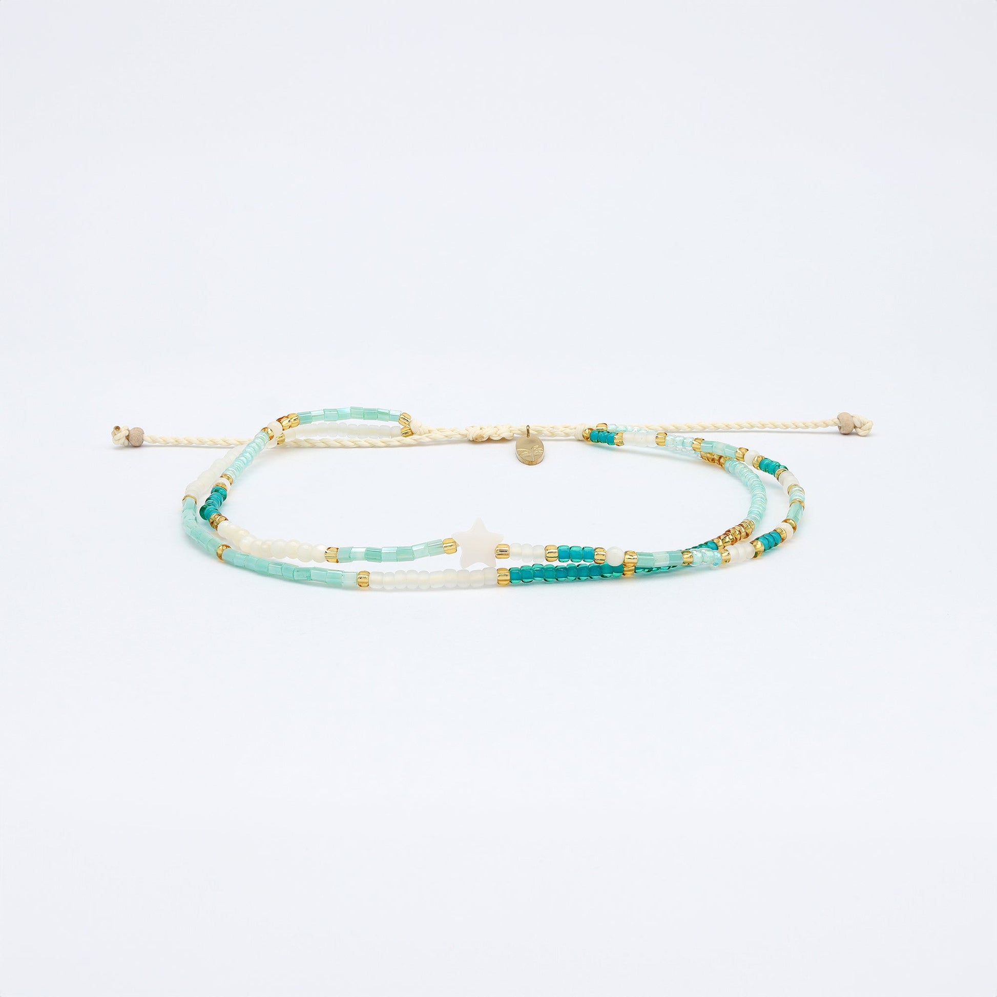 Named after the Indonesian word for star, the Bintang Laut Beaded Anklet captures the magic of starlit seas and salty air. With ocean-toned glass seed beads in soft hues of turquoise, golden accents, and a dreamy mother-of-pearl star charm, this double-layer anklet brings all the beachy vibes.