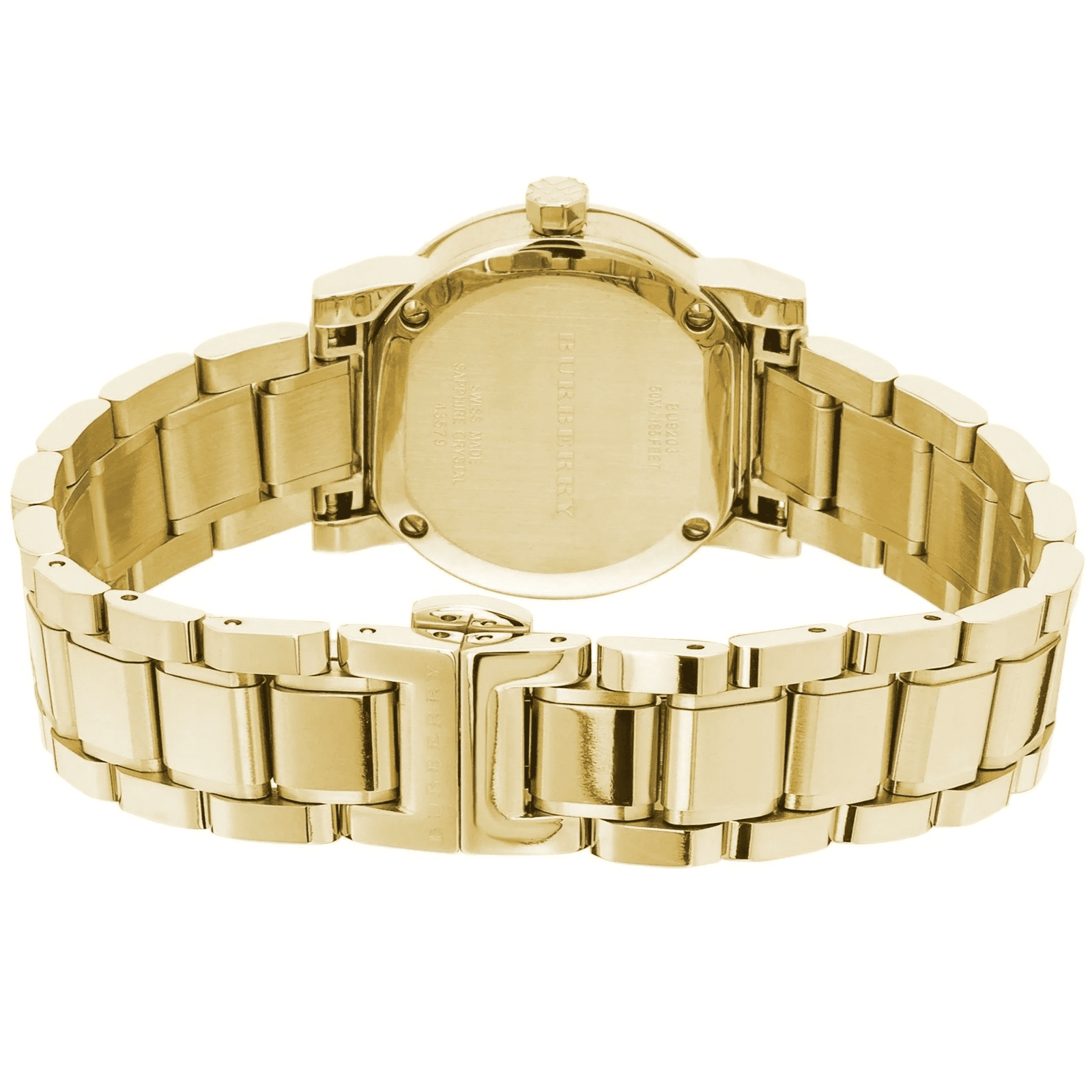 Burberry The Ladies Gold Ion-Plated Stainless Steel Burberry Bracelet Watch BU9203 is a fantastic lady's watch. This watch has a 26mm stainless steel case with an analog display. The watch has a gold tone dial with a gold ionized stainless steel strap and is powered by a quartz movement. The watch comes with a presentation box and is water resistant up to 50 meters