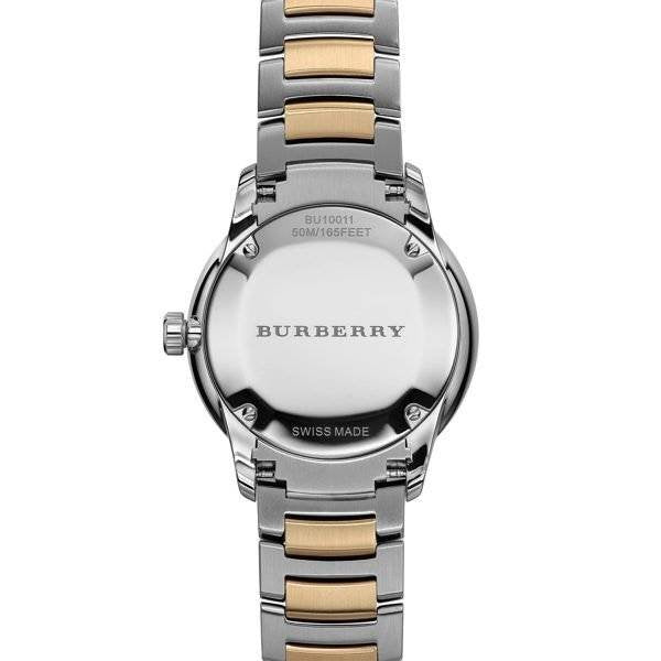 Burberry BU10011 Men's The Classic Stainless Steel Watch. The watch is powered by a quartz movement and fastens with a stainless steel strap. Other features include a date function, champagne dial and button hour markers. The watch comes with a Burberry presentation box.