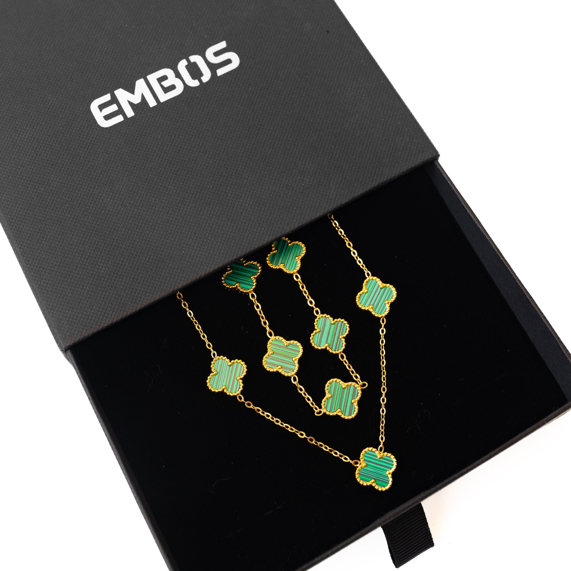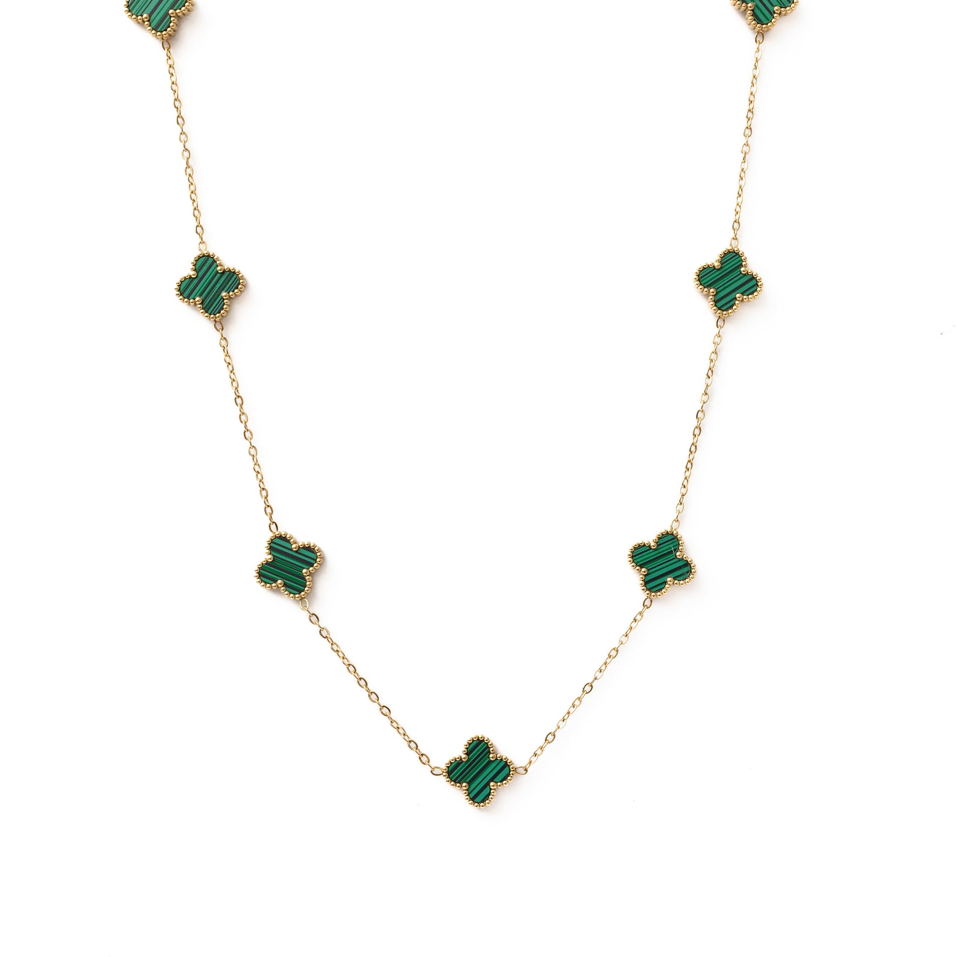 Add a touch of luck and style to your outfit with the Clover Set. This elegant gold and green necklace and bracelet set features clover-shaped charms that will bring good fortune and charm wherever you go. Perfect for any occasion, this set is a must-have for any fashion-forward individual.