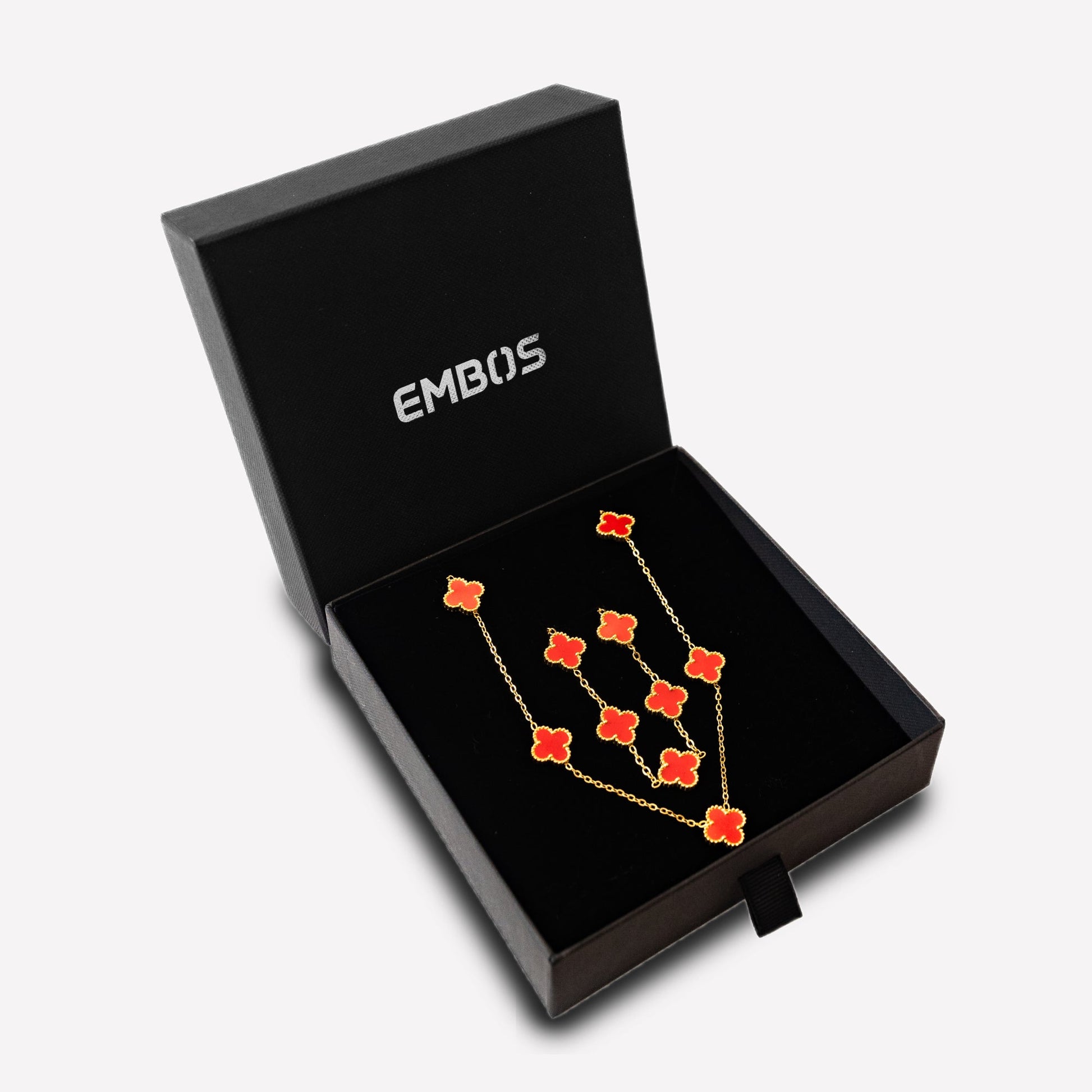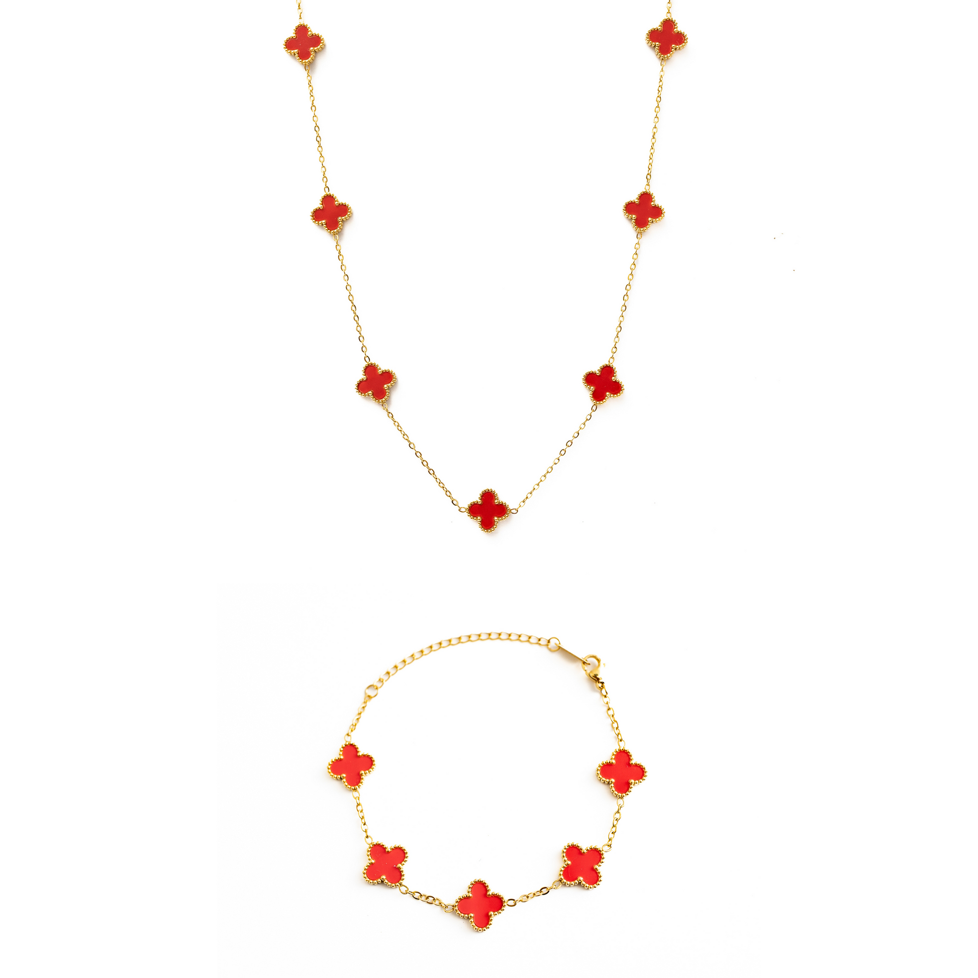 Dress up your outfit with our elegant Clover Set in gold and red. Handcrafted with delicate clover charms, this necklace and bracelet set exudes an optimistic vibe. Perfect for any occasion, add a touch of sophistication to your style with this must-have accessory.