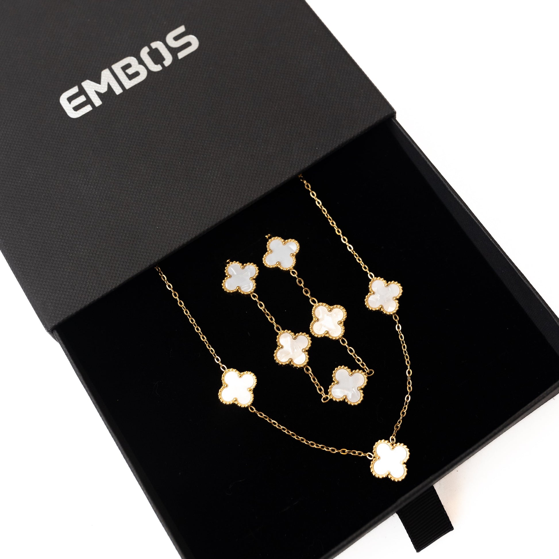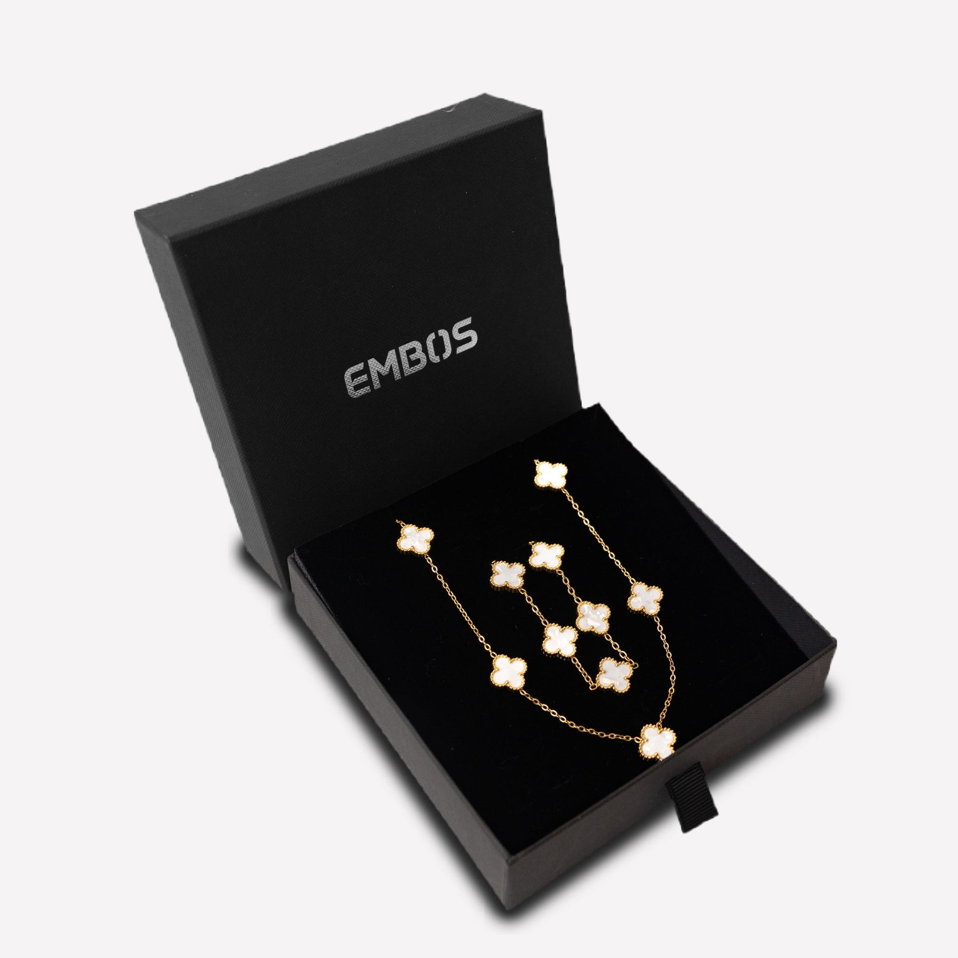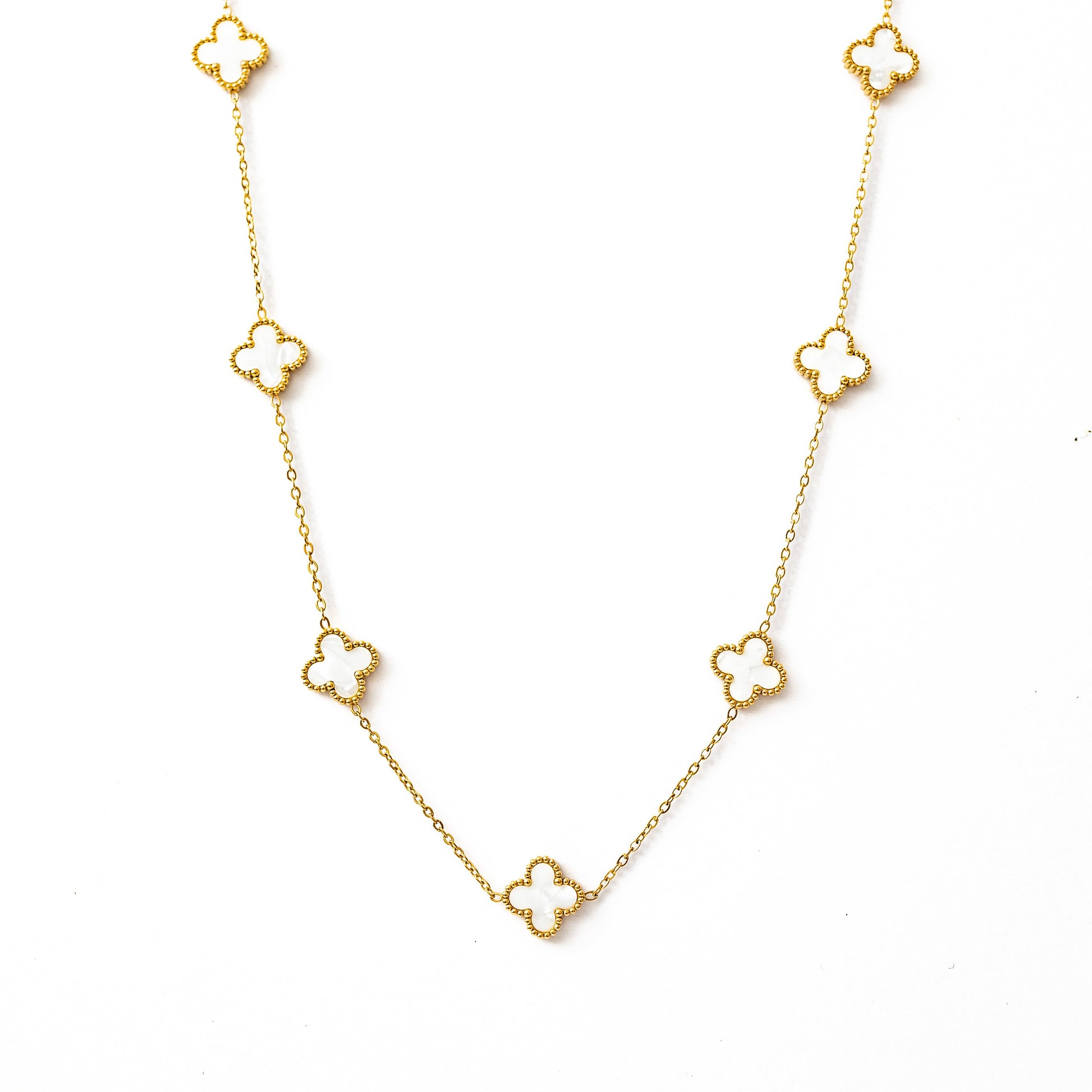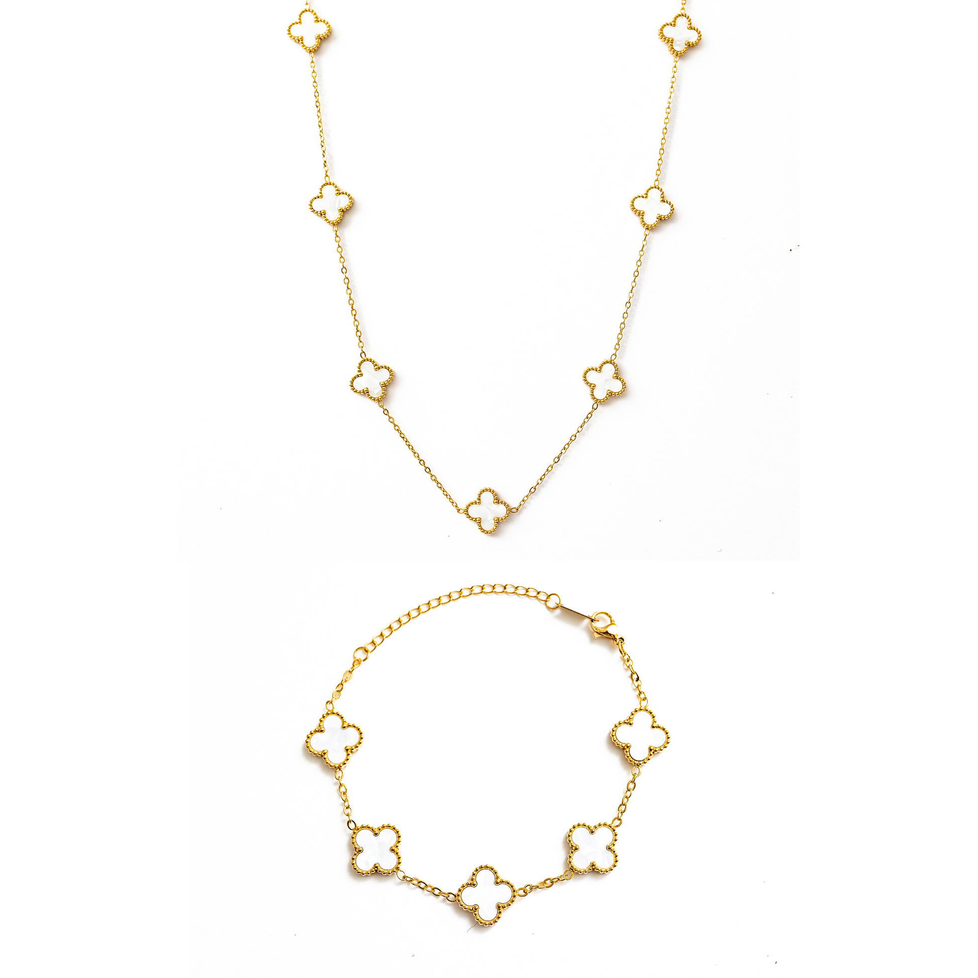 Elevate any outfit with our stylish Clover Set in Gold and White. This set includes a necklace and bracelet, adding a touch of elegance to your look. Perfect for any occasion, its versatile design allows you to effortlessly transition from day to night.