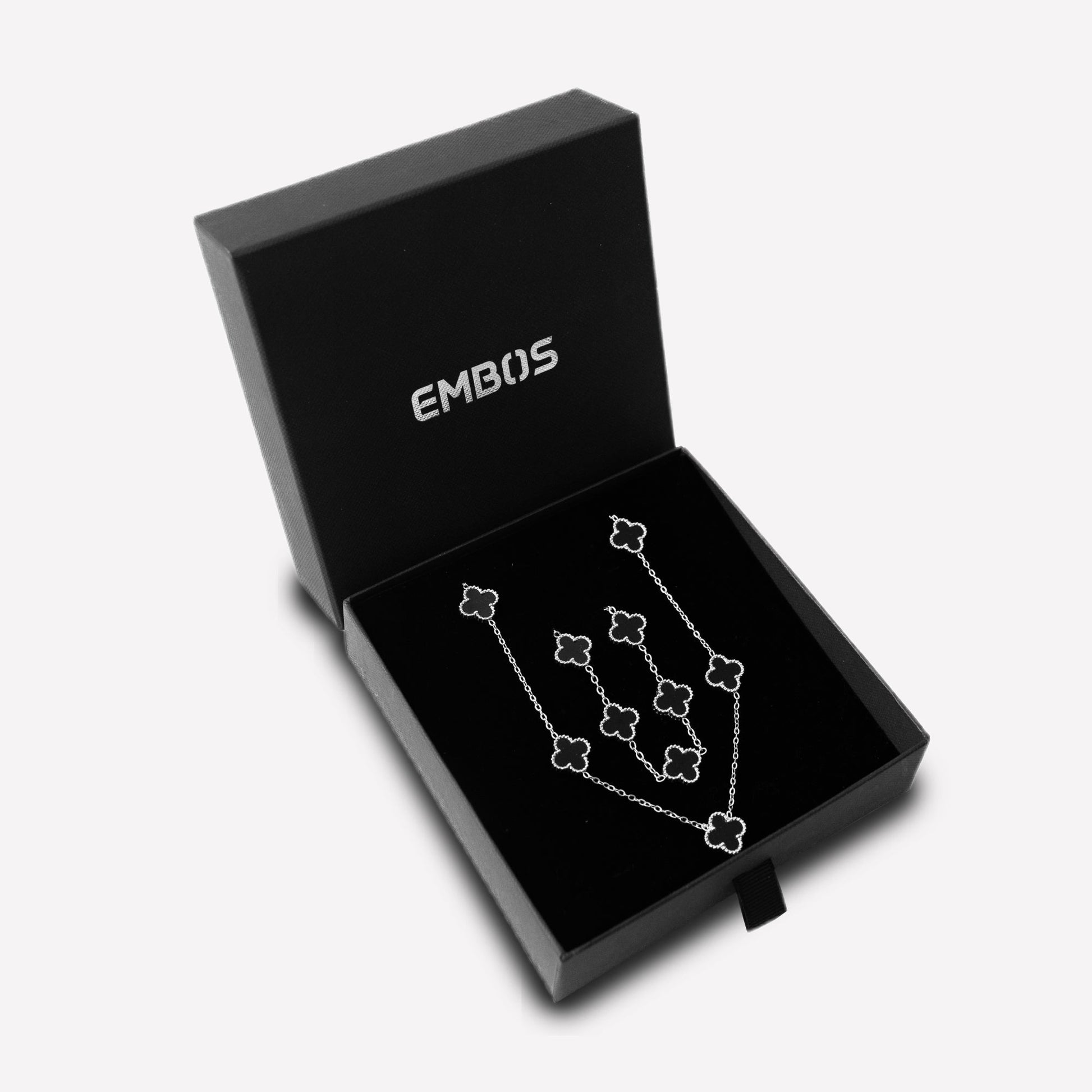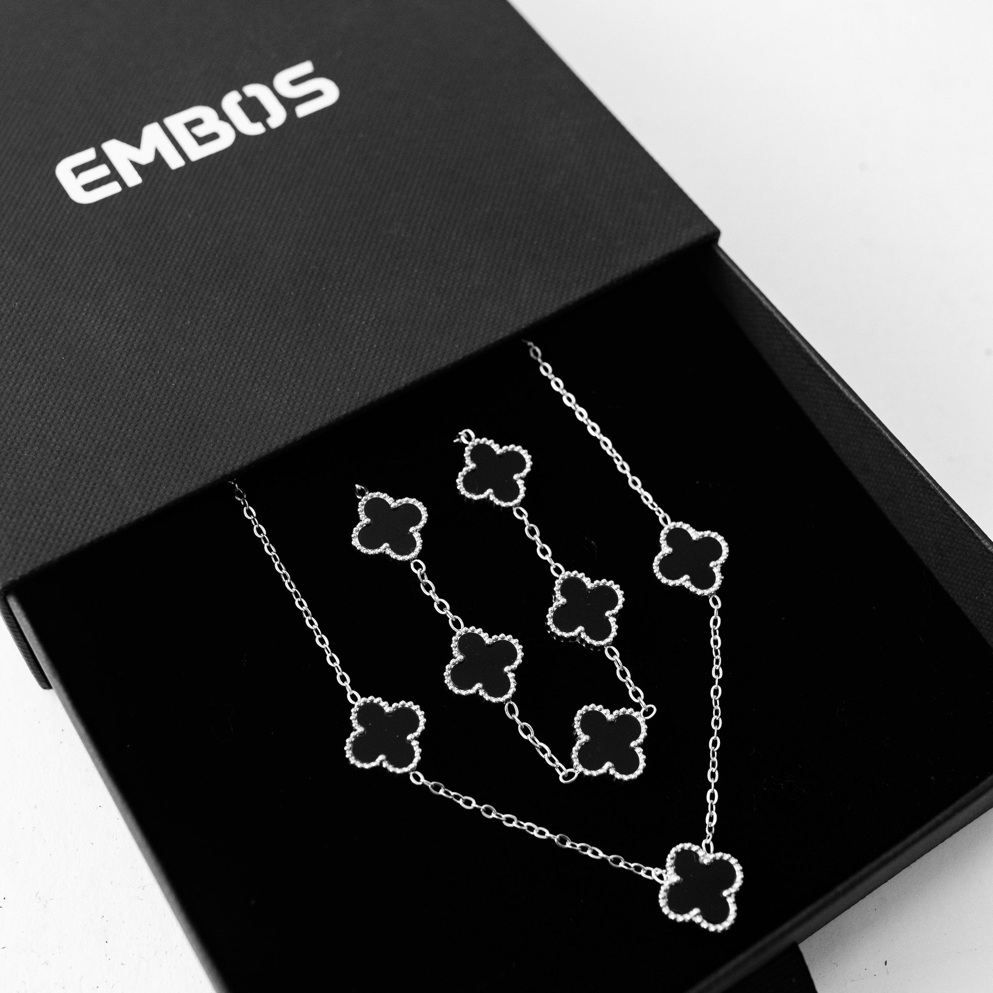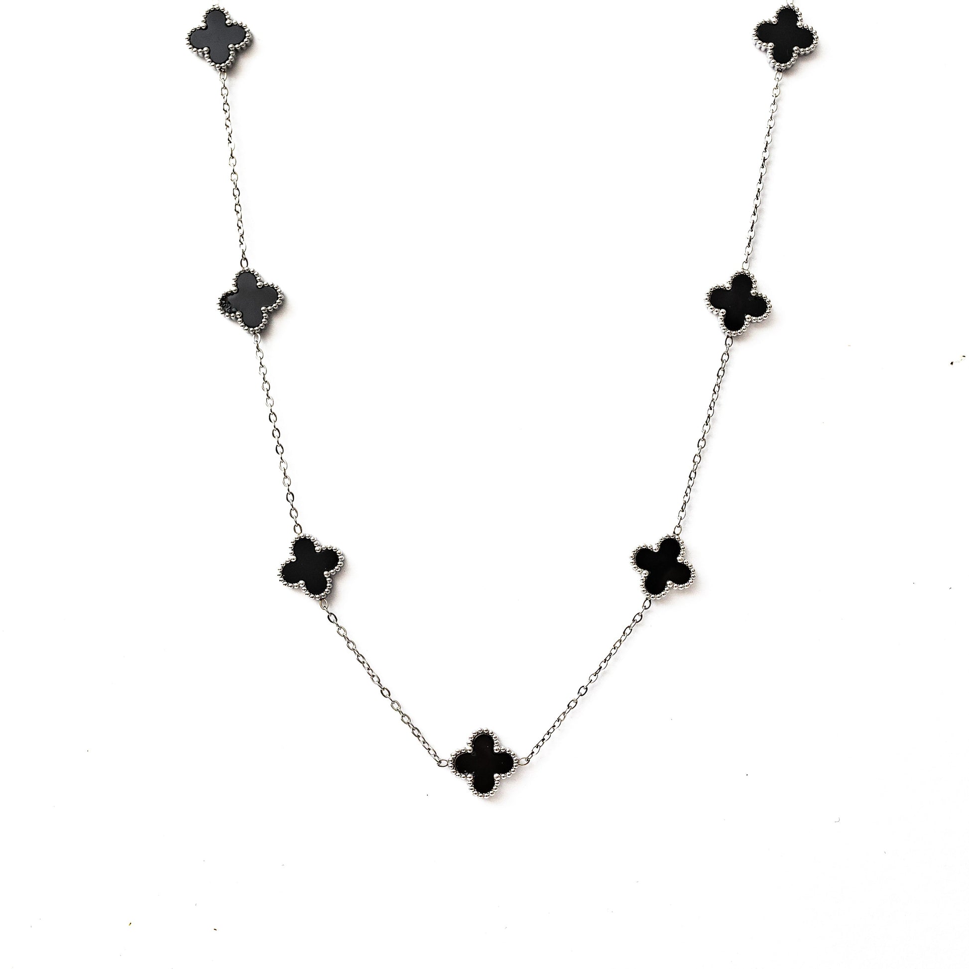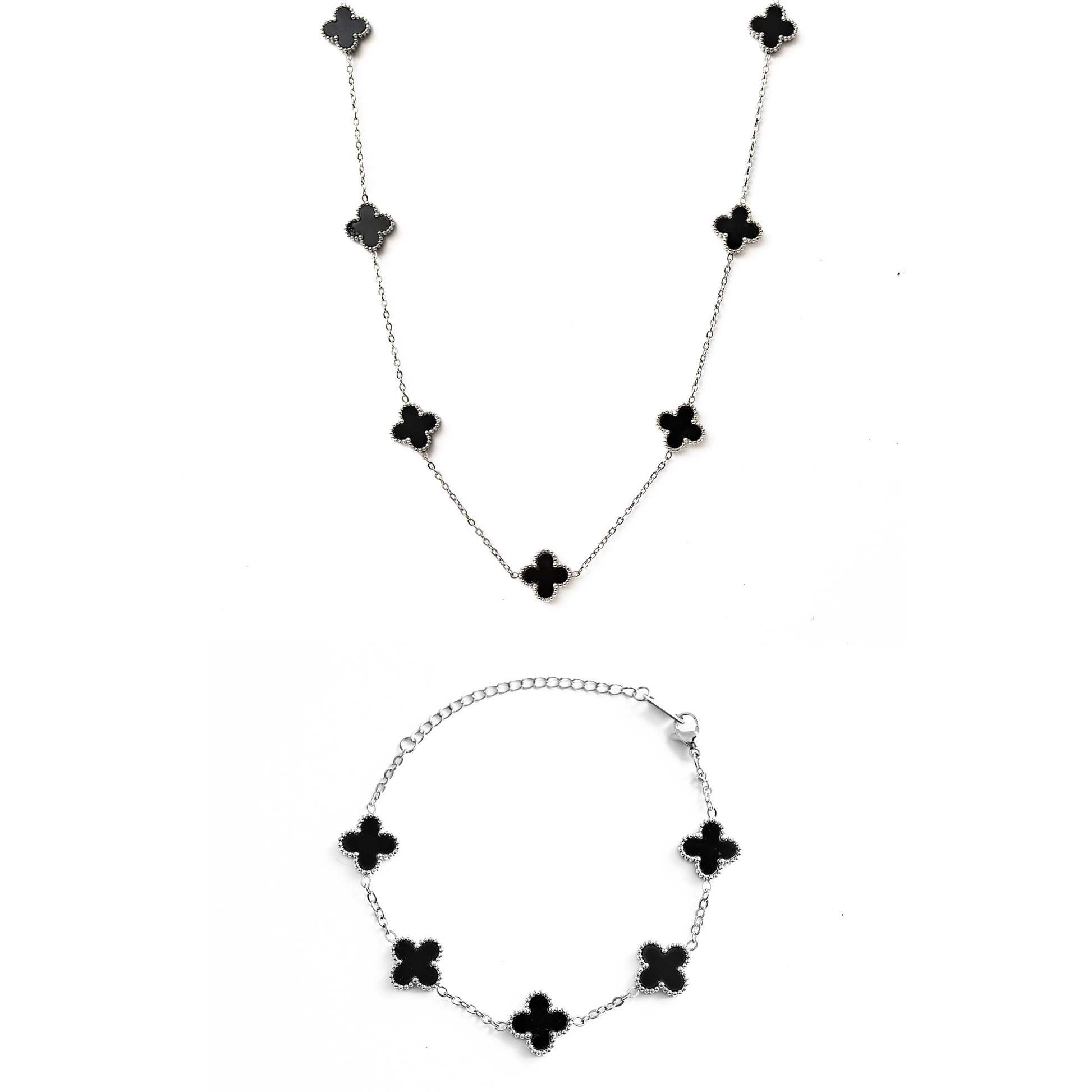 Elevate your style with our Clover Set in silver and black! This stunning necklace and bracelet duo will add a touch of sophistication to any outfit. Perfect for everyday wear or special occasions, the Clover Set is a must-have for any fashion-forward individual.