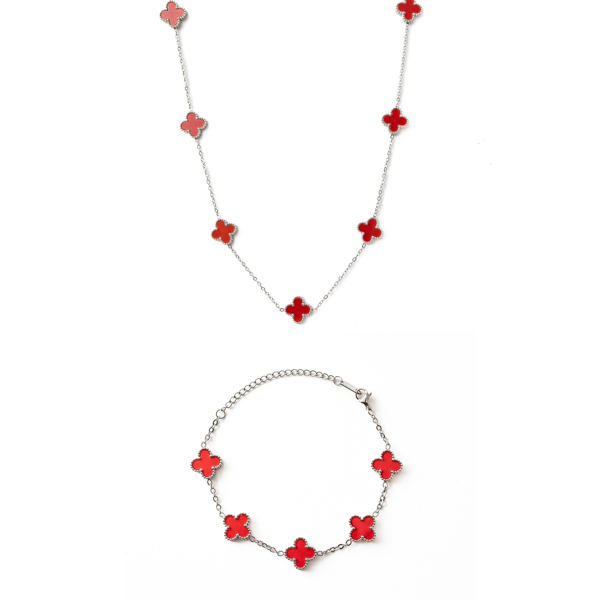 This Clover Set (Silver/Red) is a must-have for any fashion-forward individual. The necklace and bracelet, both adorned with stunning silver and red clover charms, will add a touch of elegance and good luck to any outfit. Whether for yourself or as a gift, this set is sure to delight.