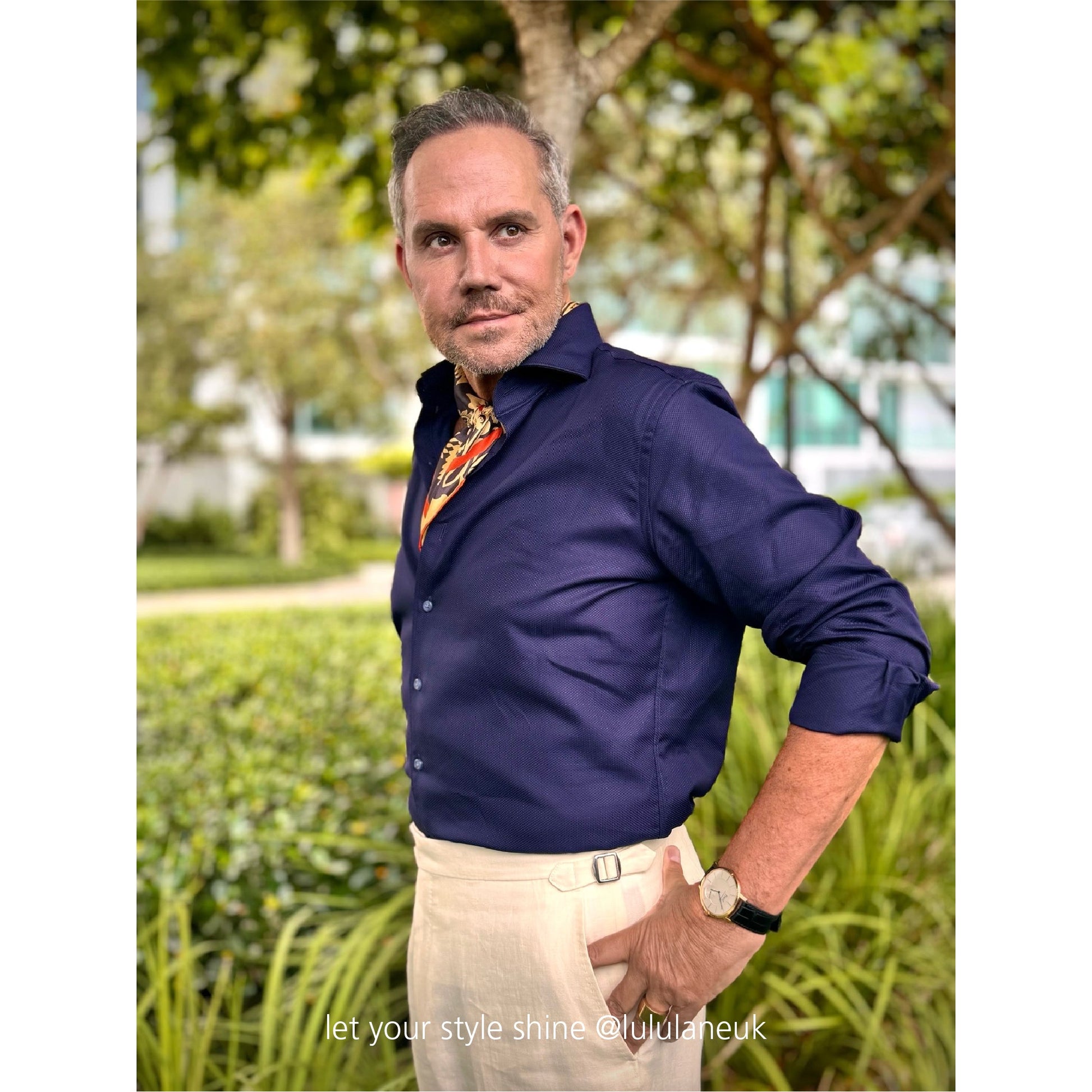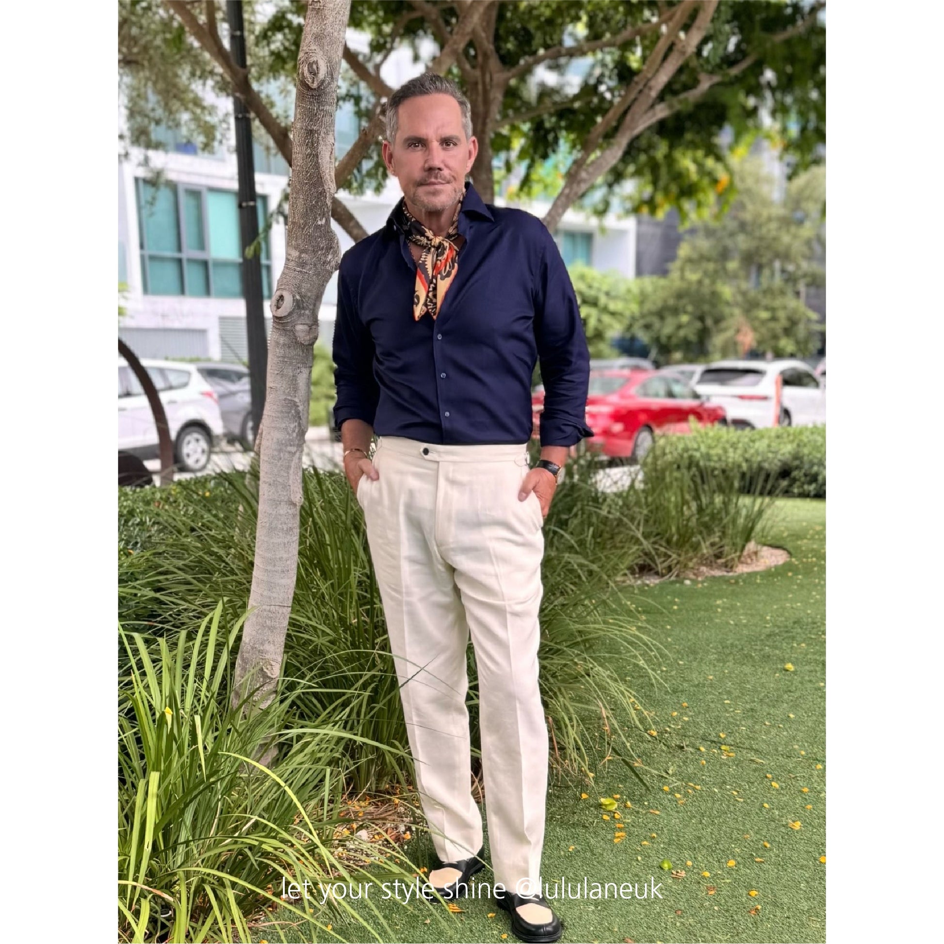 - Timeless navy & beige tones with a bold orange border for effortless sophistication