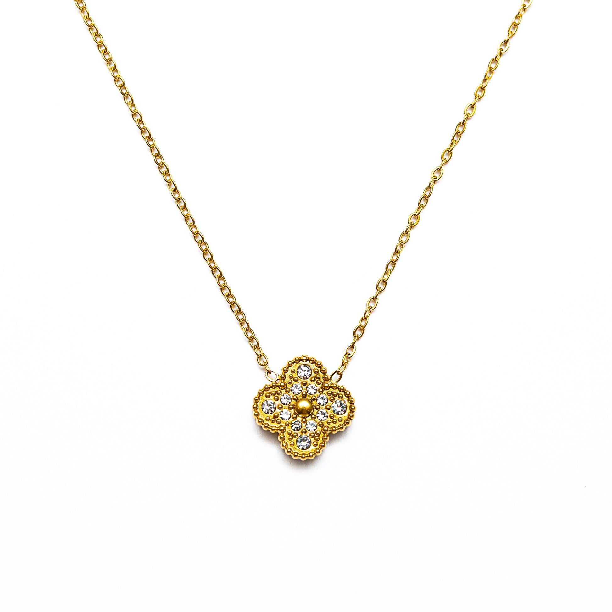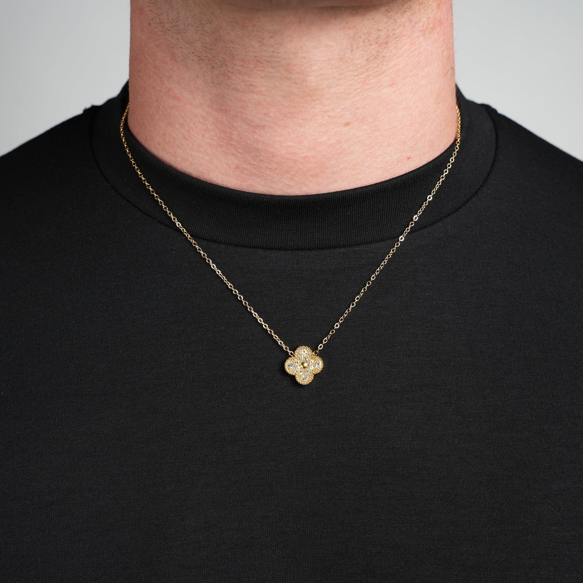 Experience the magic of our Diamond Single Clover Necklace (Gold). A stunning piece with a delicate single clover design, adorned with brilliant diamonds for a touch of elegance. Perfect for adding a touch of sophistication to any outfit and sure to bring you luck wherever you go.