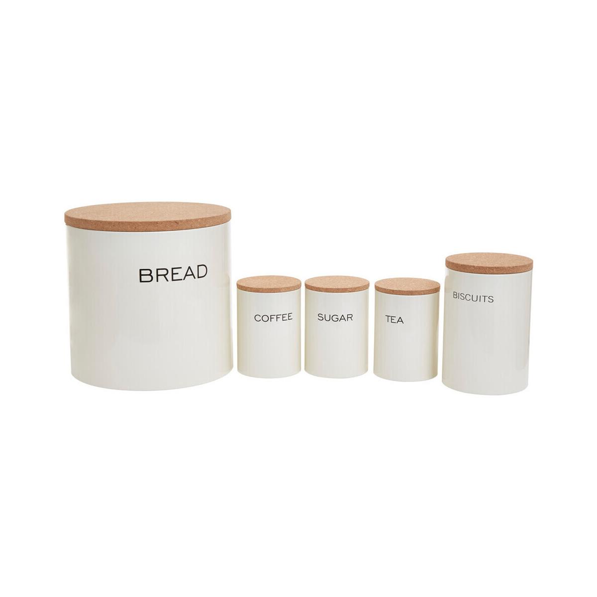 This 5 piece kitchen storage sets exude timeless elegance. Each container is made from durable metal with a bamboo lid, fitting them seamlessly into any kitchen aesthetic.This set includes tea, coffee and sugar canisters, along with a generously sized bread bin and biscuit tin – all conveniently labelled for your convenience.