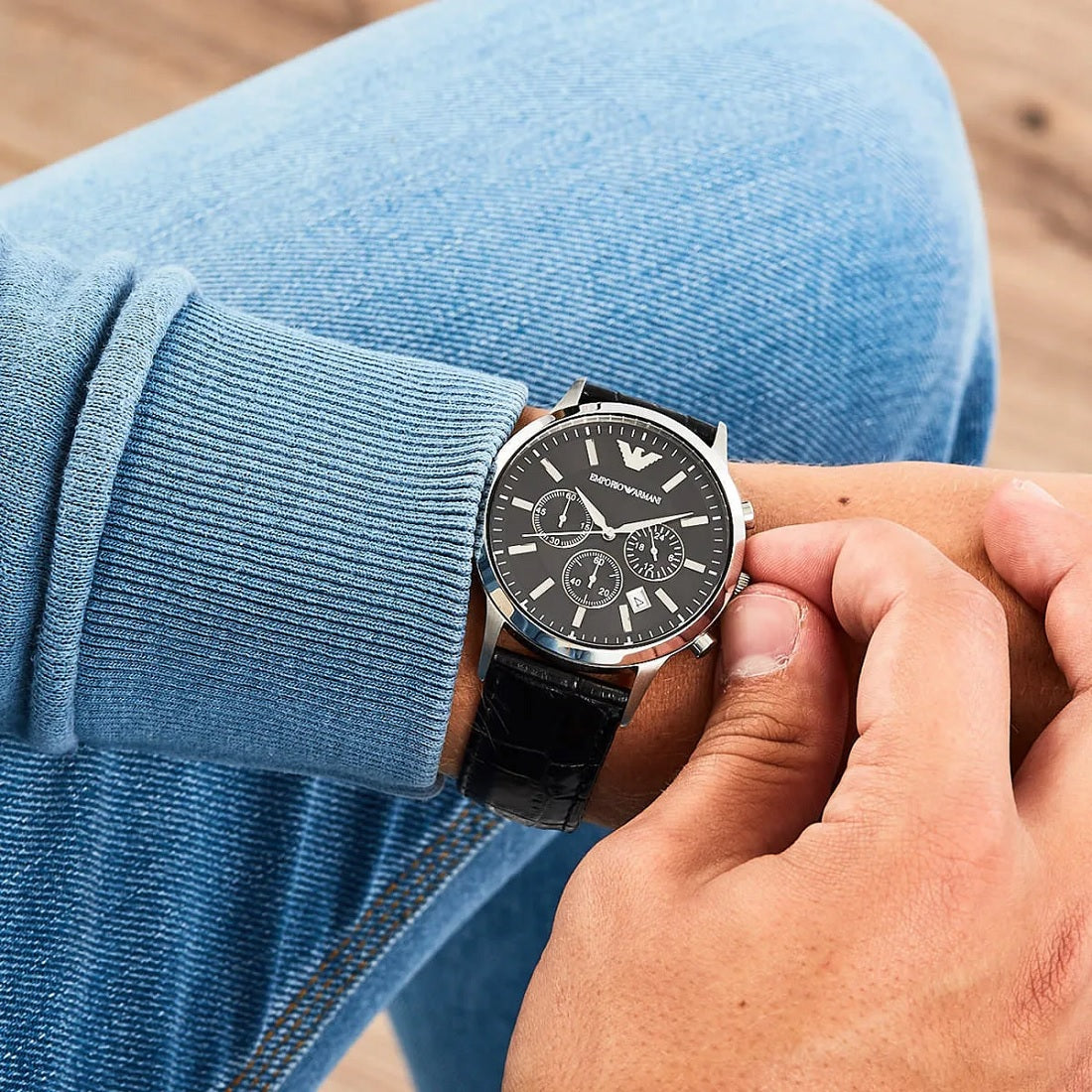 Emporio Armani Men’s Watch Leather Black Strap With Black Dial And Silver Case AR2447 Renato