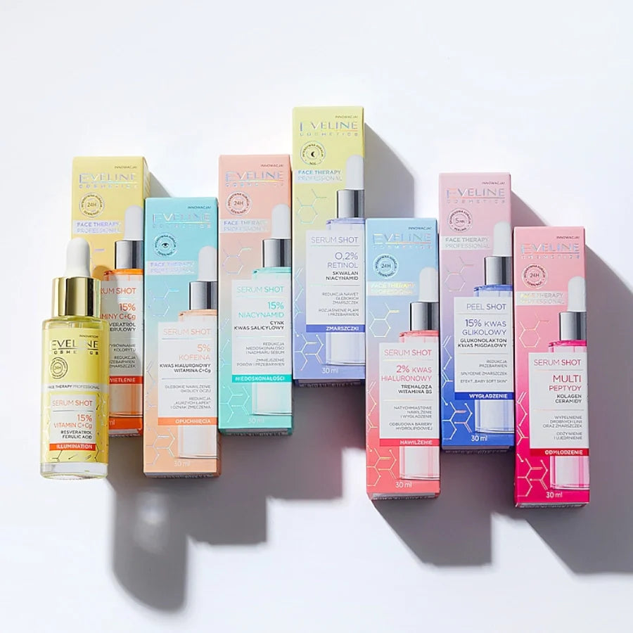 The treatment with 15% niacinamide from Eveline Cosmetics from the Serum Shot series effectively cares for oily, problematic and acne skin. The unique active ingredients contained in the serum improve the texture of the skin, reduce the secretion of sebum and restore the freshness of the skin and evens out its color. The serum soothes the symptoms of acne and smoothes. It has a vegan formula.