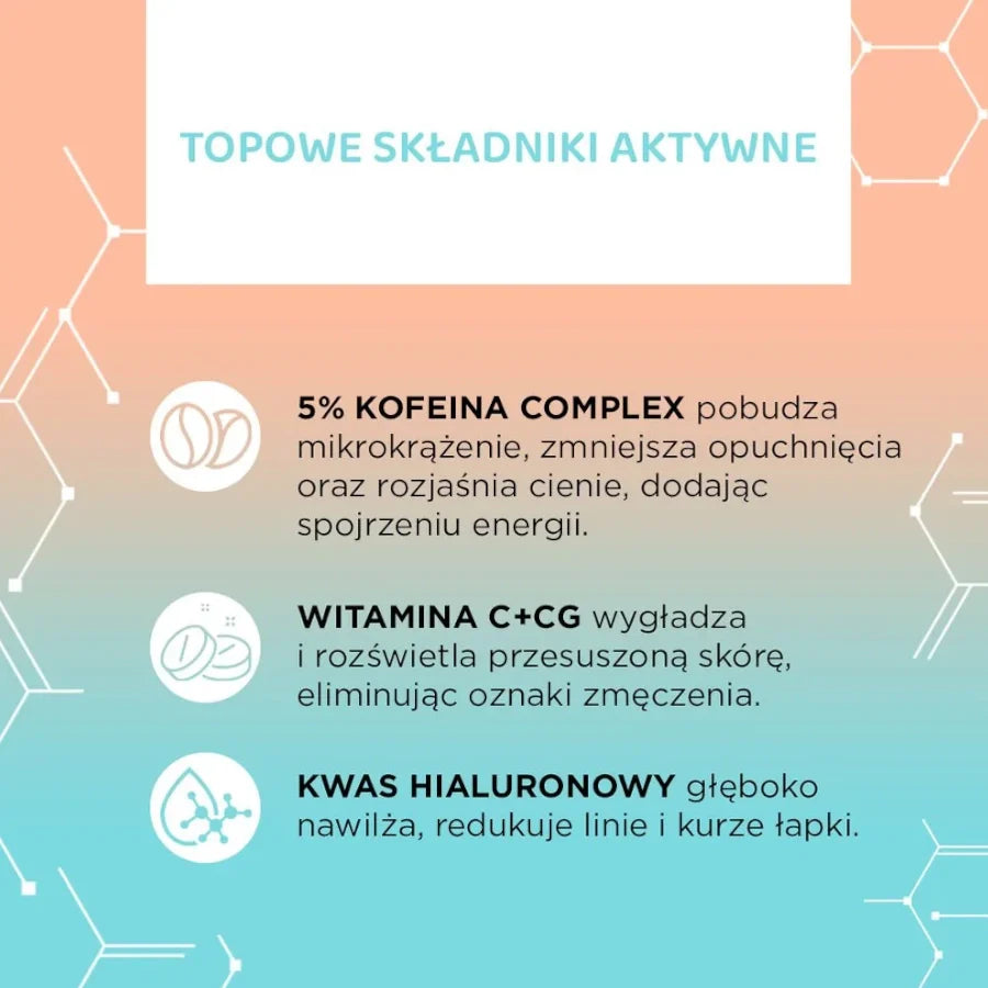 - The serum contains 5% caffeine, which stimulates the skin. It reduces dark circles and puffiness under the eyes. Adds radiance to the skin and nourishes,