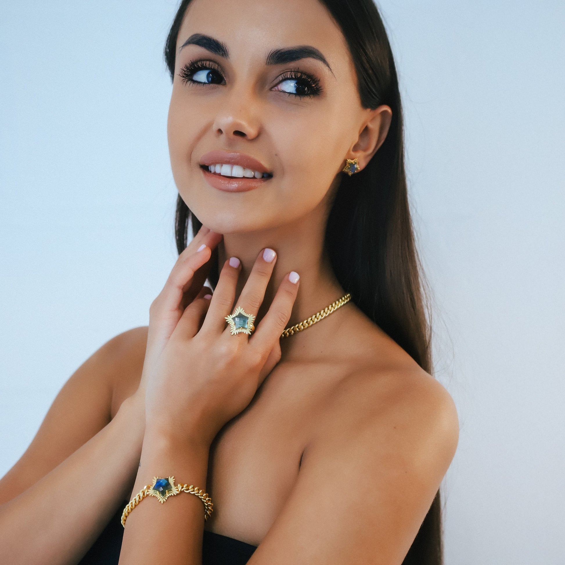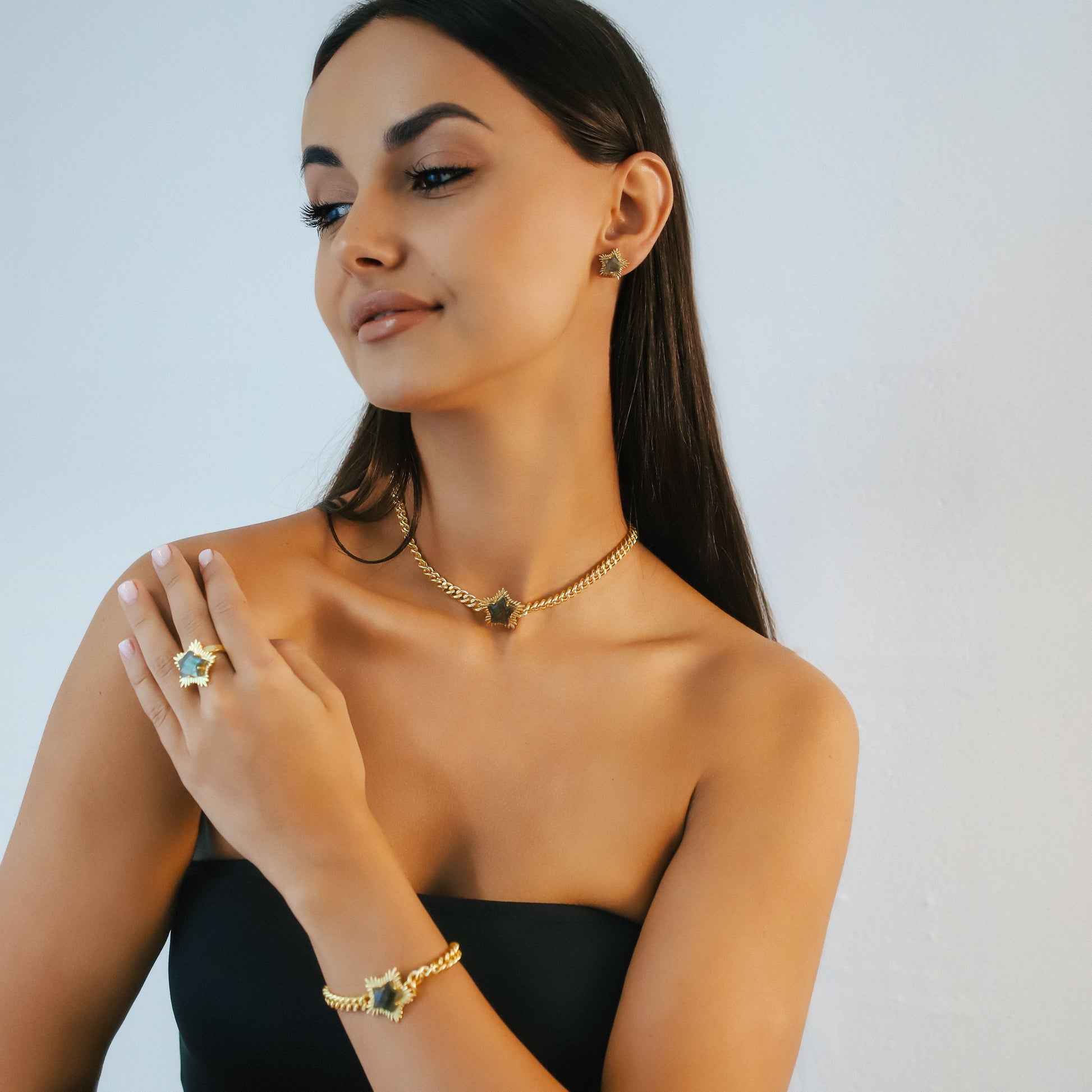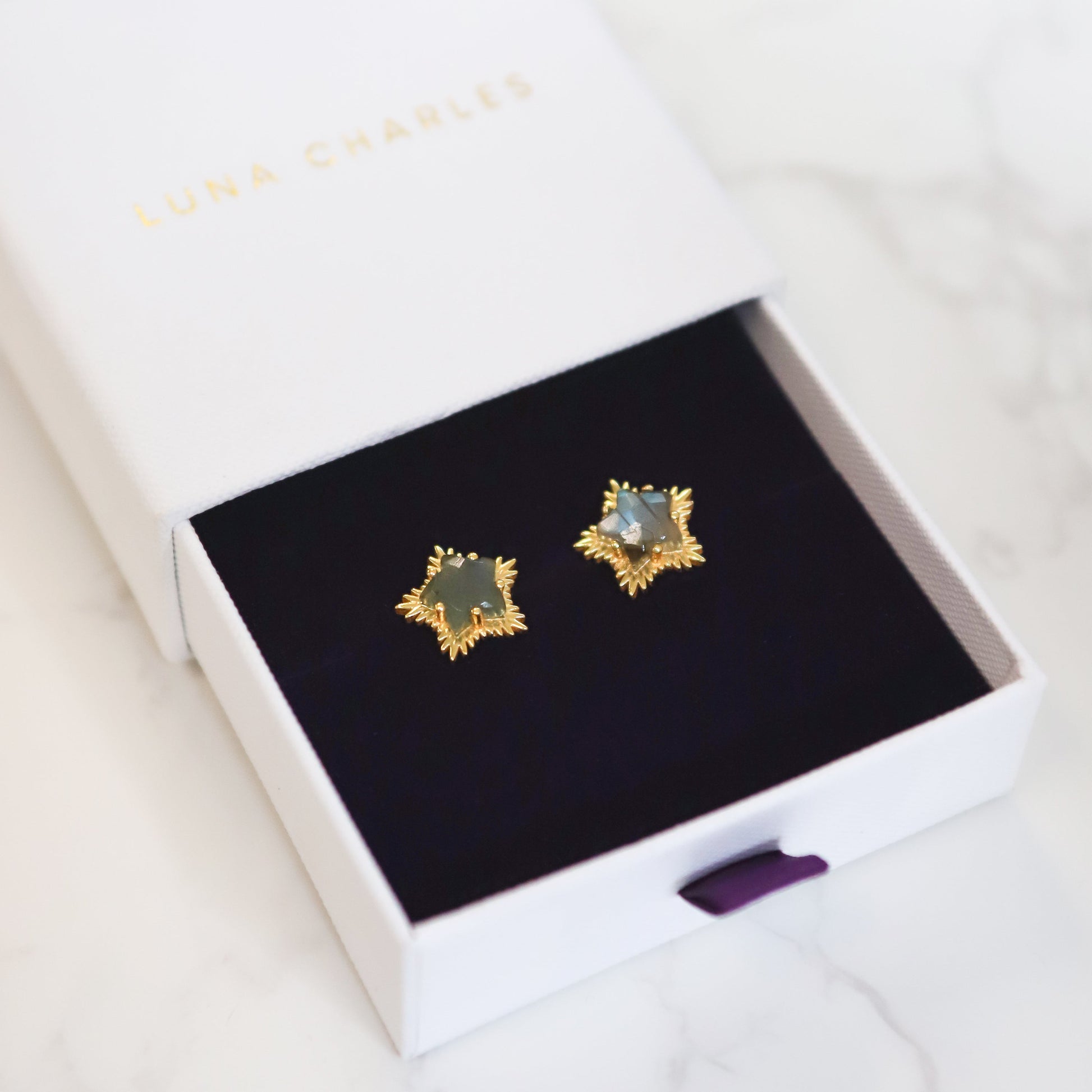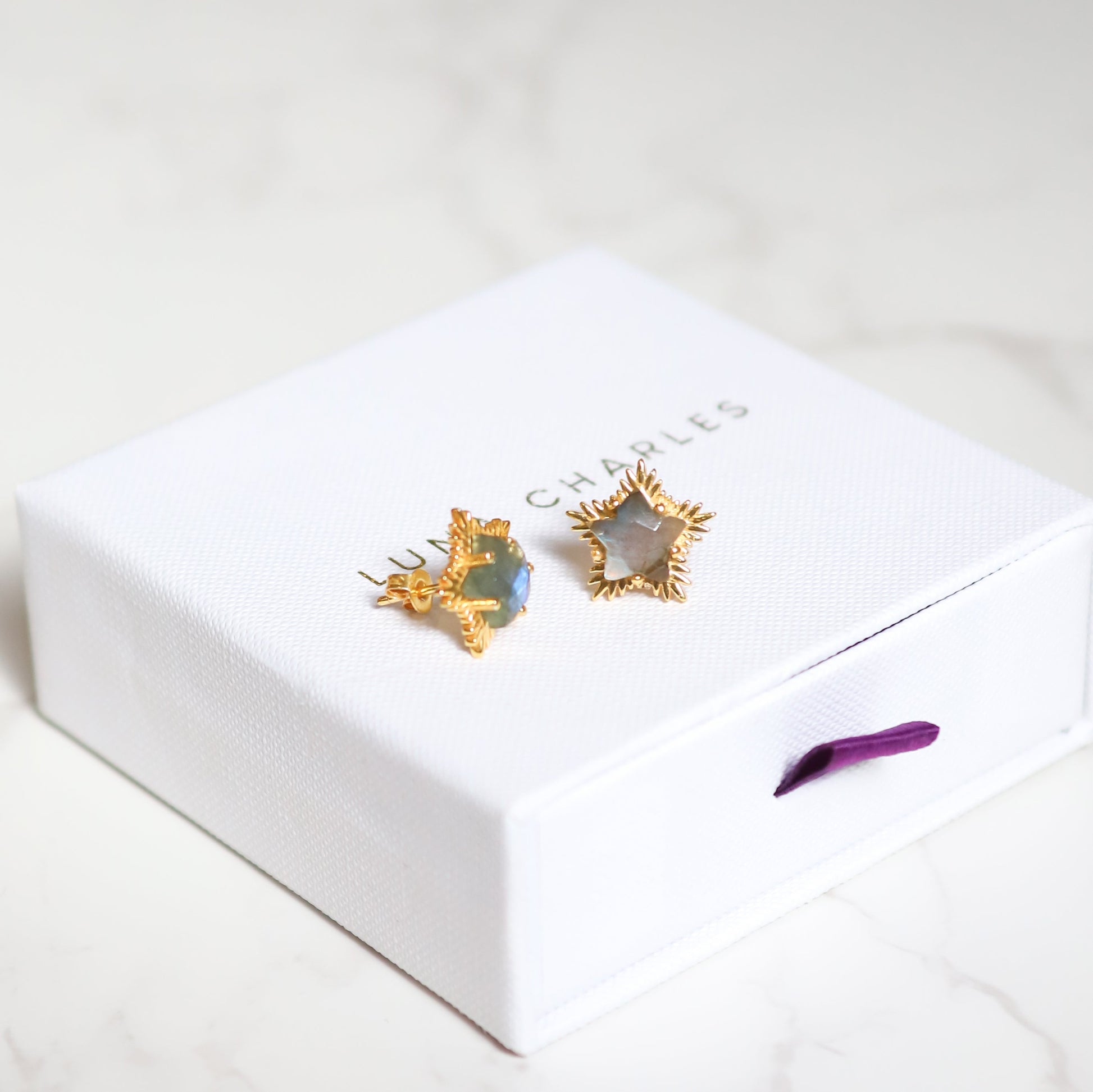 Felicity are a stunning new addition to the Luna Charles collection, they are gorgeous statement earrings that are 100% guaranteed to get you noticed. Featuring a natural labradorite stone star encased inside a larger spiky star set on a stud earring, she really is an eye catcher.