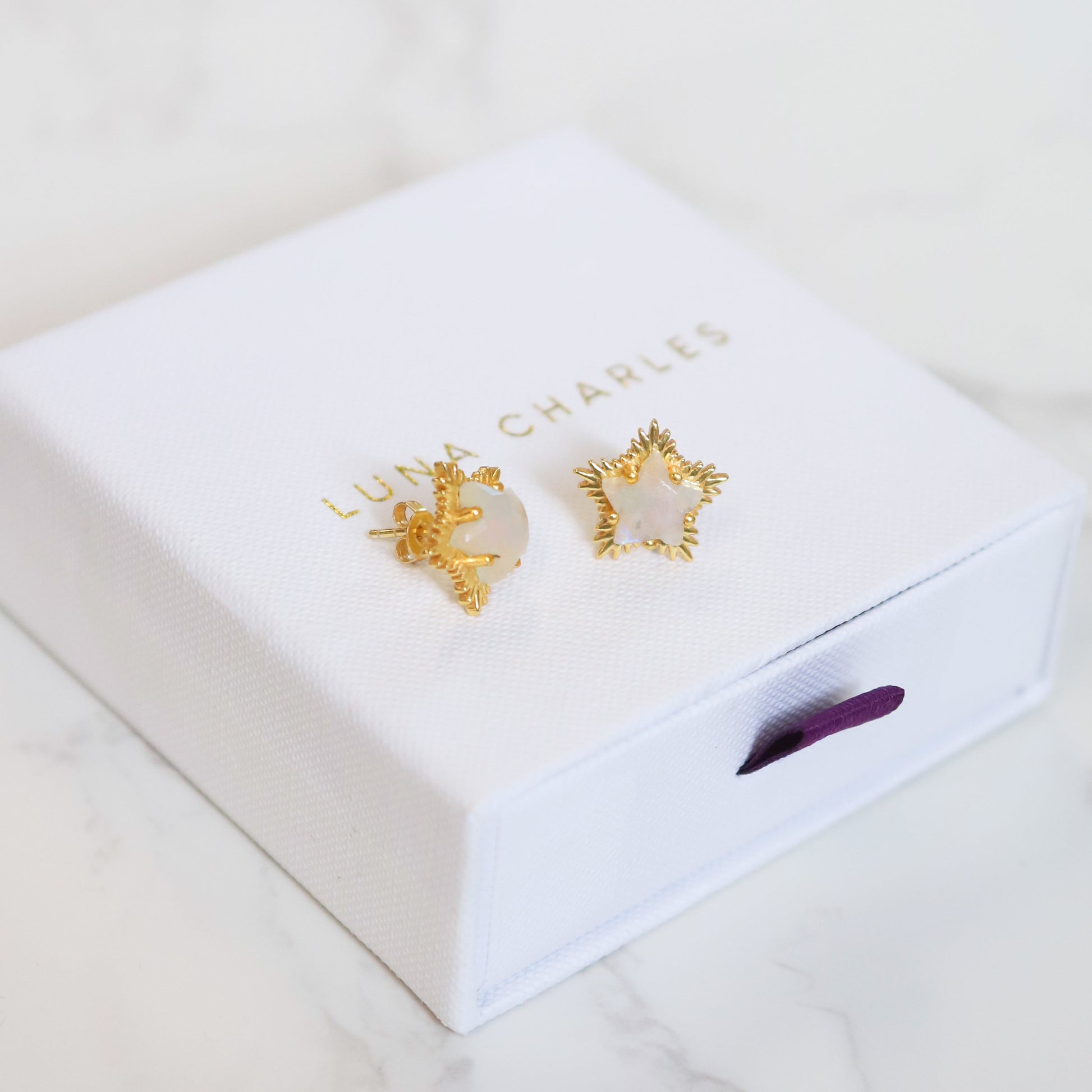 Felicity are a stunning new addition to the Luna Charles collection, they are gorgeous statement earrings that are 100% guaranteed to get you noticed. Featuring a natural moonstone stone star encased inside a larger spiky star set on a stud earring, she really is an eye catcher.