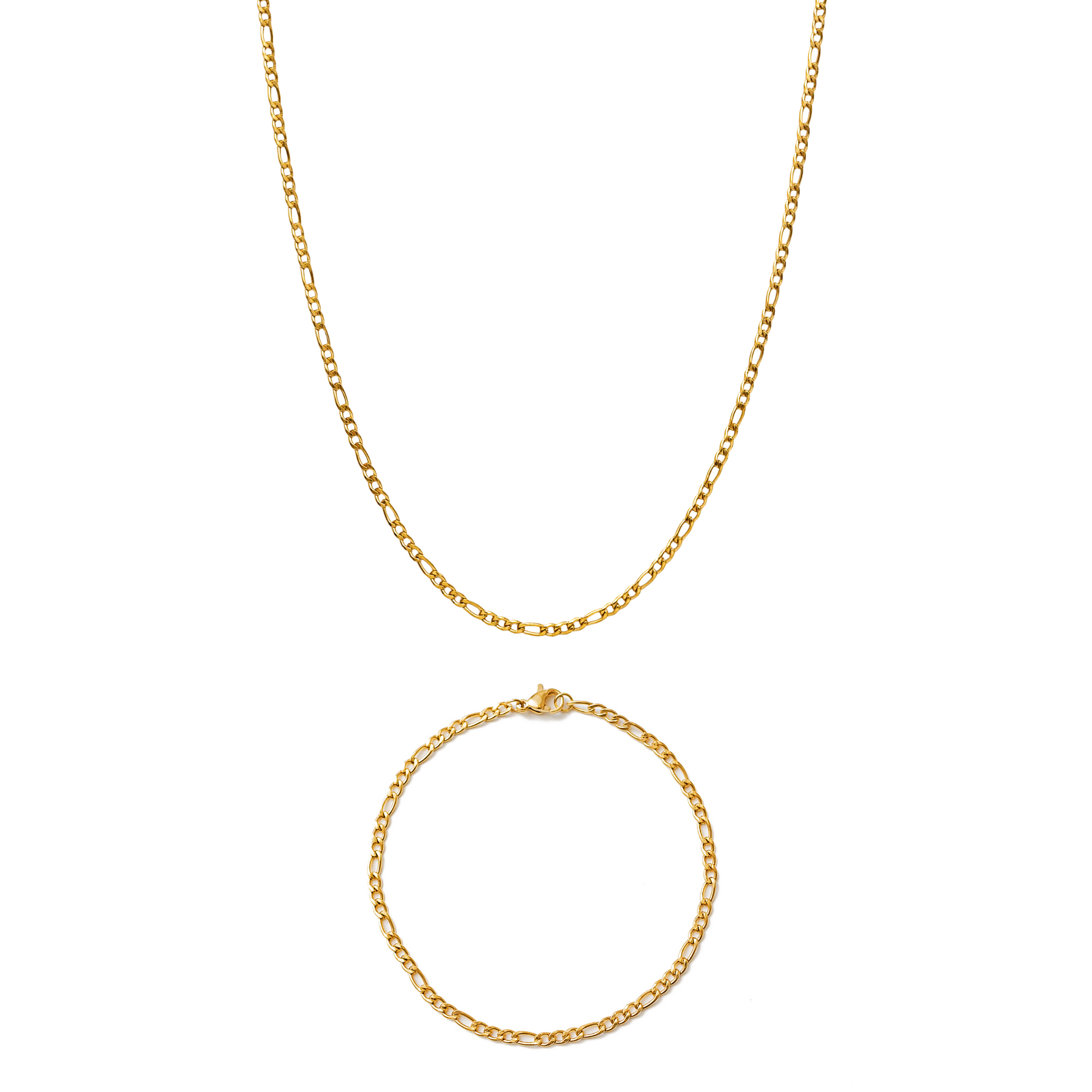 Enhance your style with the Figaro Set in Gold, featuring a classic figaro bracelet and matching chain. This elegant set brings a warm, luxurious glow to any outfit, perfect for both daily wear and special moments. Enjoy timeless design and versatile sophistication in one beautiful package.