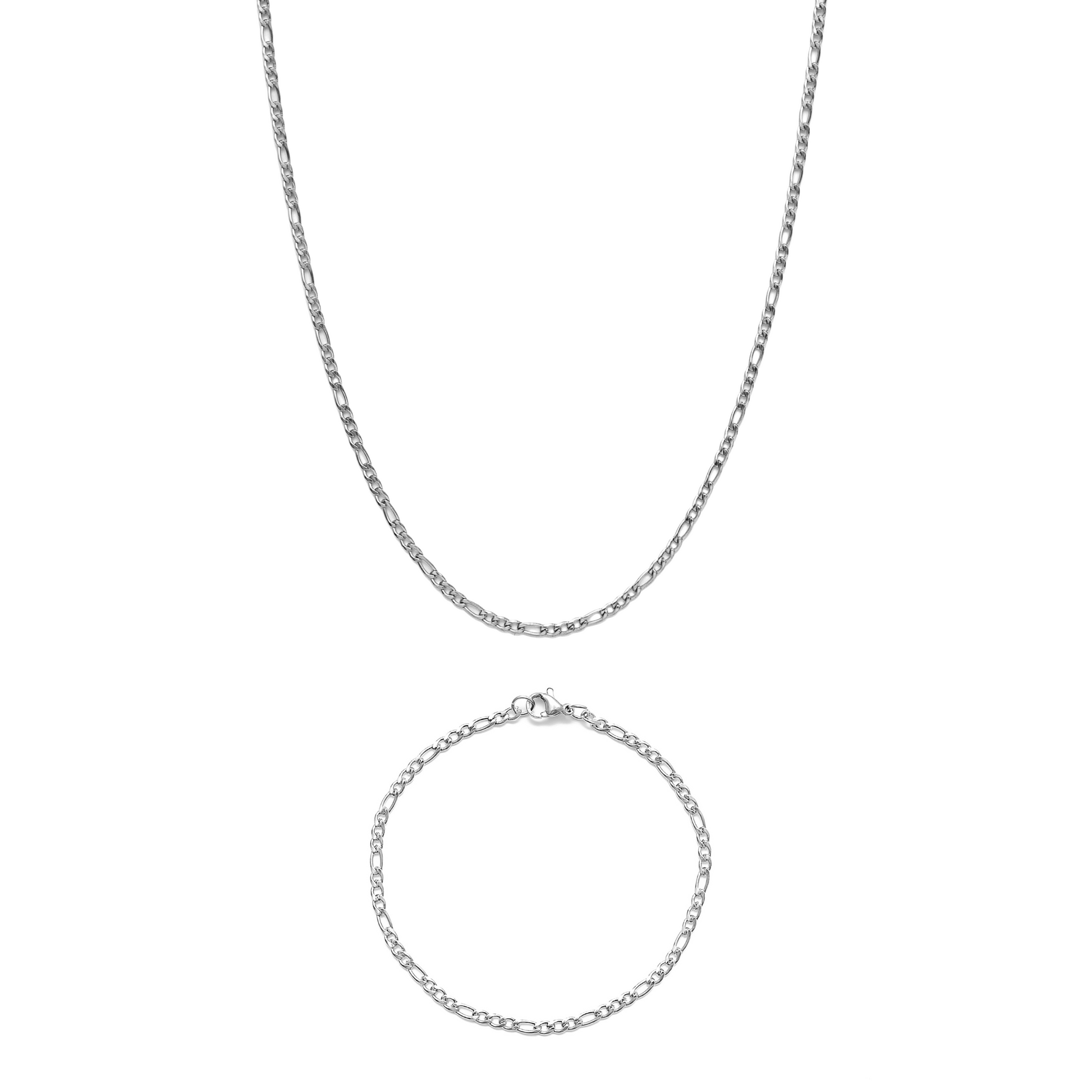 Elevate your accessory collection with the Figaro Set in Silver, featuring a stylish bracelet and matching chain. This classic design offers a perfect blend of elegance and versatility, making it ideal for both everyday wear and special occasions. Add a touch of timeless sophistication to your look with this beautifully crafted set.