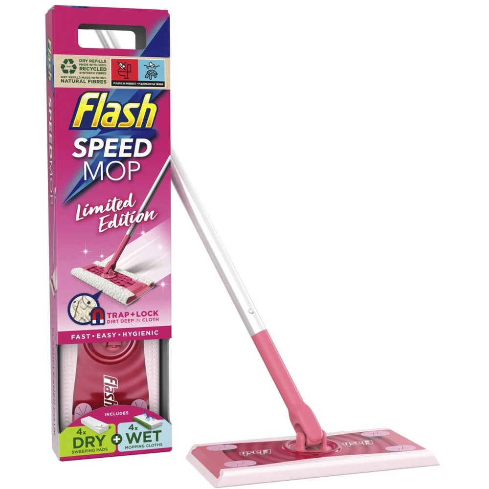 Flash Speedmop Floor Cleaner is the quick, easy and hygienic way to keep on top of daily floor dirt. The handy Speedmop stick assembles in seconds, then keeps out of your way with its slender profile; which also makes it perfect for reaching awkward places like under the sofa, around the bin or down the side of the washing machine. Attach Flash Speedmop Wet Cloths, which are packed with a powerful dirt-dissolving solution to pull dirt from surfaces and lock it away. In fact they're 2x thicker and wetter than floor wipes! The unique cleaning solution dissolves tough dirt, grease and grime. Packed with classic Flash lemon scent. The thick wet cloth traps and locks dirt and grime, pulling it deep into the cloth and off your floors. To remove tough stains, simply flip the mop over and scrub the stains with the green scrubby strip. Once finished rip off the dirty wet cloth for a hygienic clean. Stand up to daily dirt with Flash Speedmop. Speedmop Starter Kit includes the Speedmop and Wet and Dry Cloths to get you started. Refill Wet Cloths can be purchased. Wet cloths are safe across finished or sealed hard surfaces, such as wood, tiles and lino. Don't use on unfinished, oiled/waxed wooden boards, or carpet. Even if you're still rocking a carpeted bathroom.