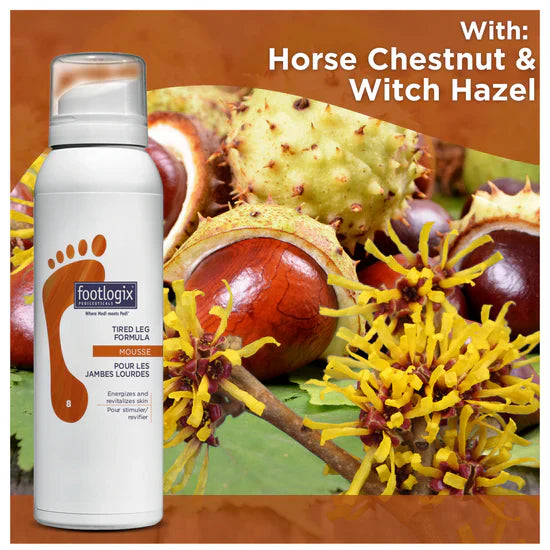 Footlogix® Tired Leg Formula is expertly crafted to revitalise and soothe tired legs and feet, leveraging the power of Dermal Infusion Technology®. Infused with Witch Hazel to provide soothing relief and Horse Chestnut to support circulation and strengthen capillary walls, this formula is ideal for those who spend long hours on their feet, frequent travelers, and individuals wearing compression hosiery. Experience the comfort and rejuvenation your legs deserve with this advanced formula.