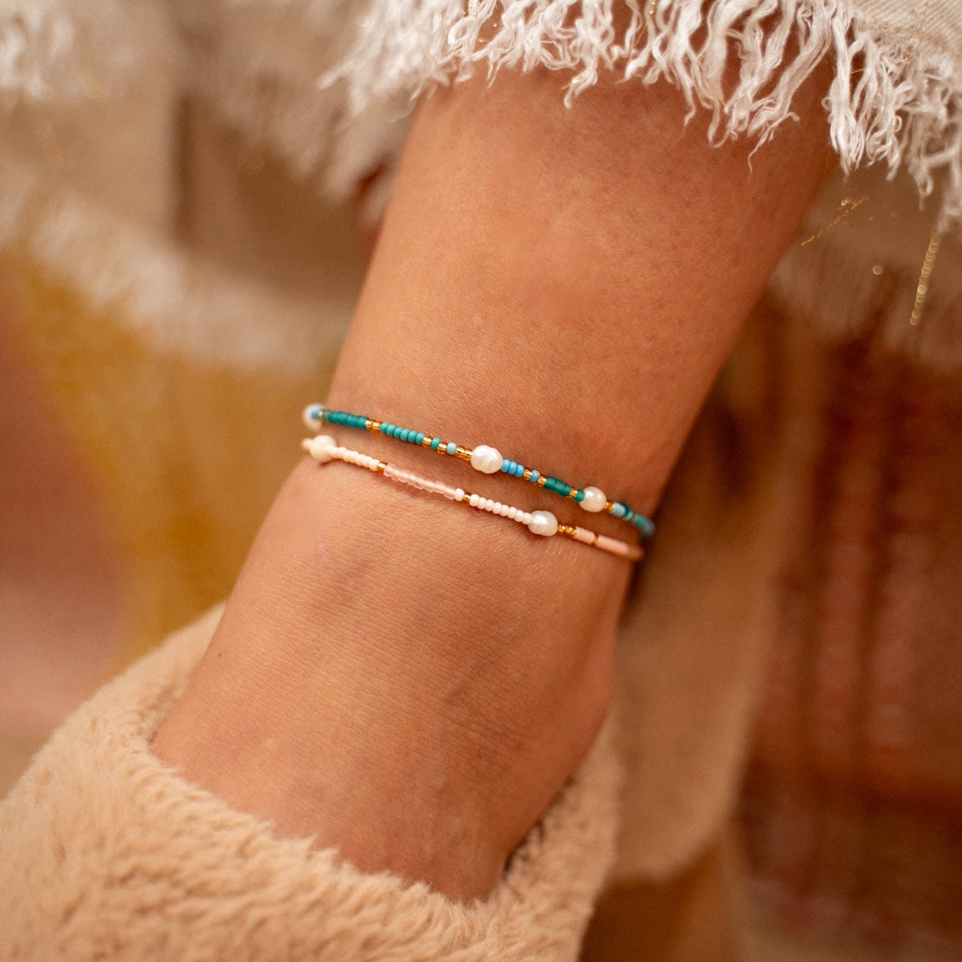 - Made with natural freshwater pearls, shimmering troca shell beads, coloured seed beads and our durable wax polyester cord!