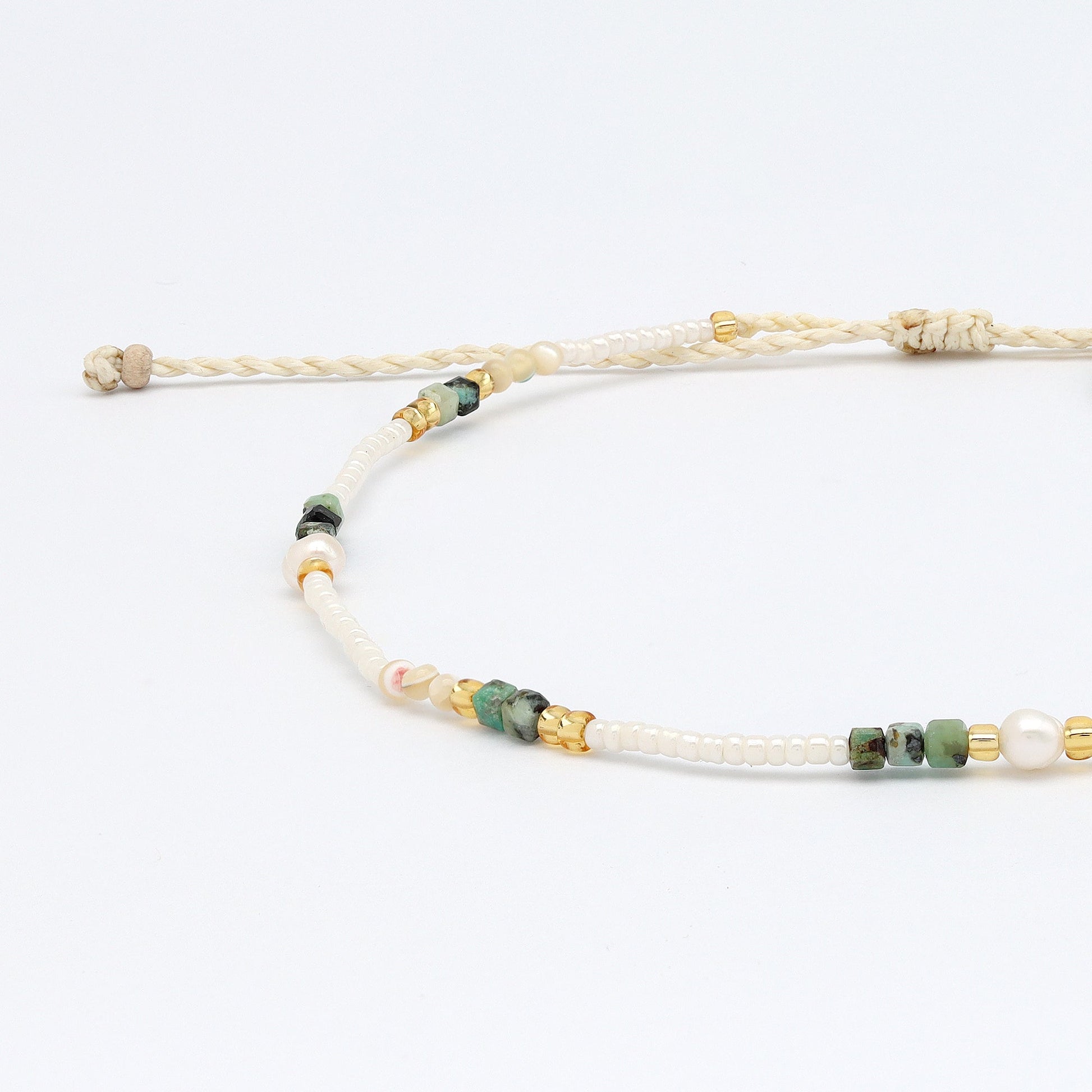 - Made with natural faceted stones, dainty glass seed beads, freshwater pearls and shimmering troca shell beads strung on a wax polyester cord.
