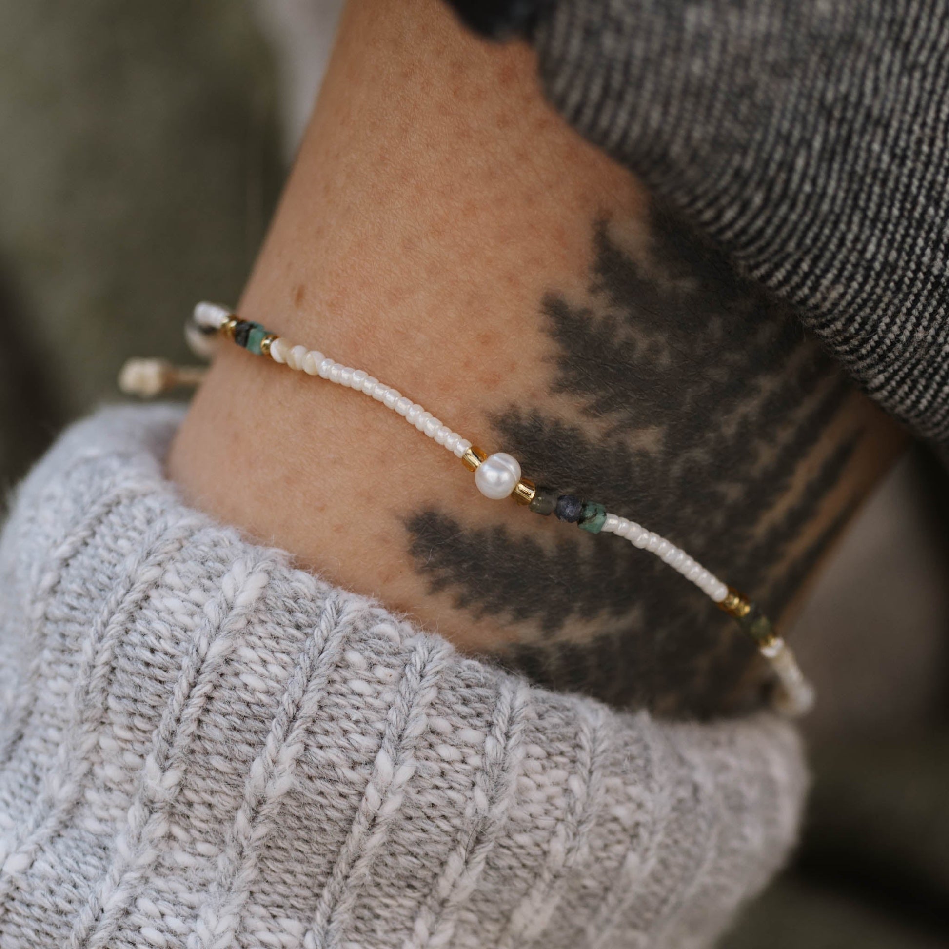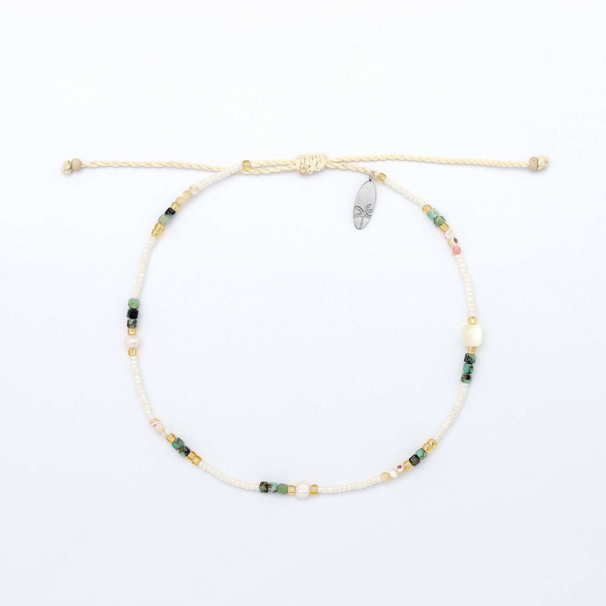 Created in collaboration with pro surfer Giada Legati, the Giada Pelita Beaded Anklet captures the guiding light of the ocean. Pelita, meaning “guiding light” in Indonesian, reflects the glow of its design and the teamwork that went into it. With its golden highlights, deep green tones, and luminous pearl beads that shimmer like sunlight on the waves.