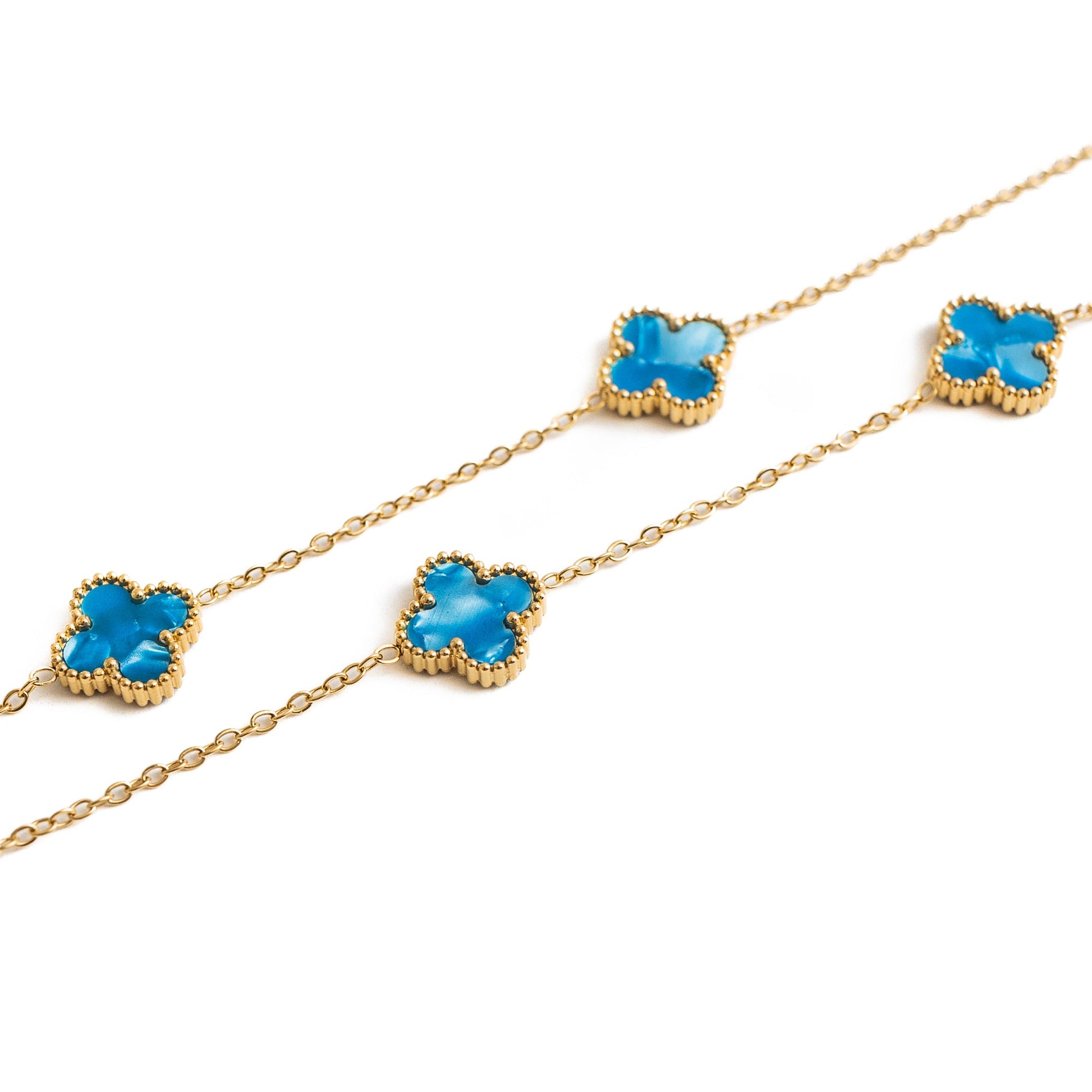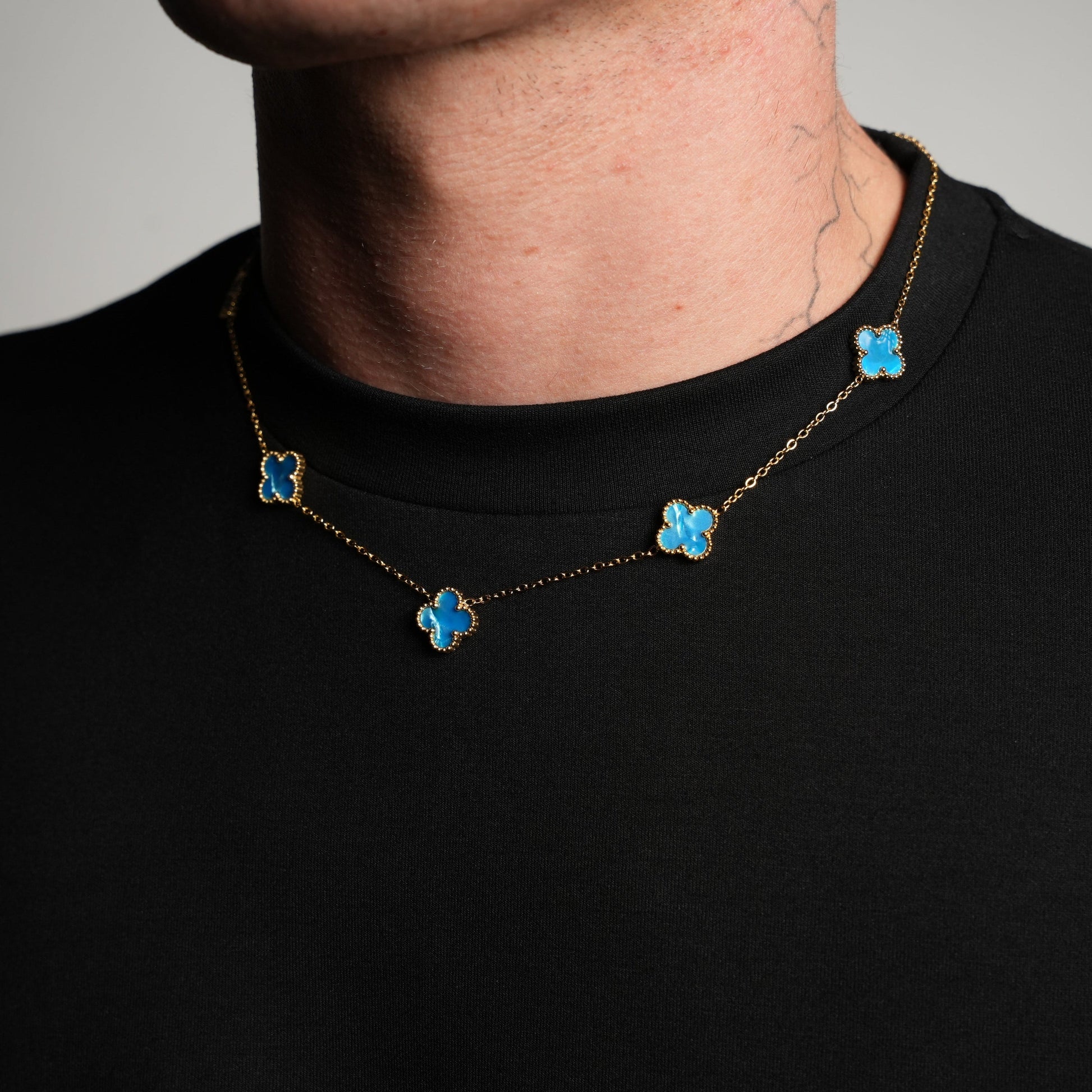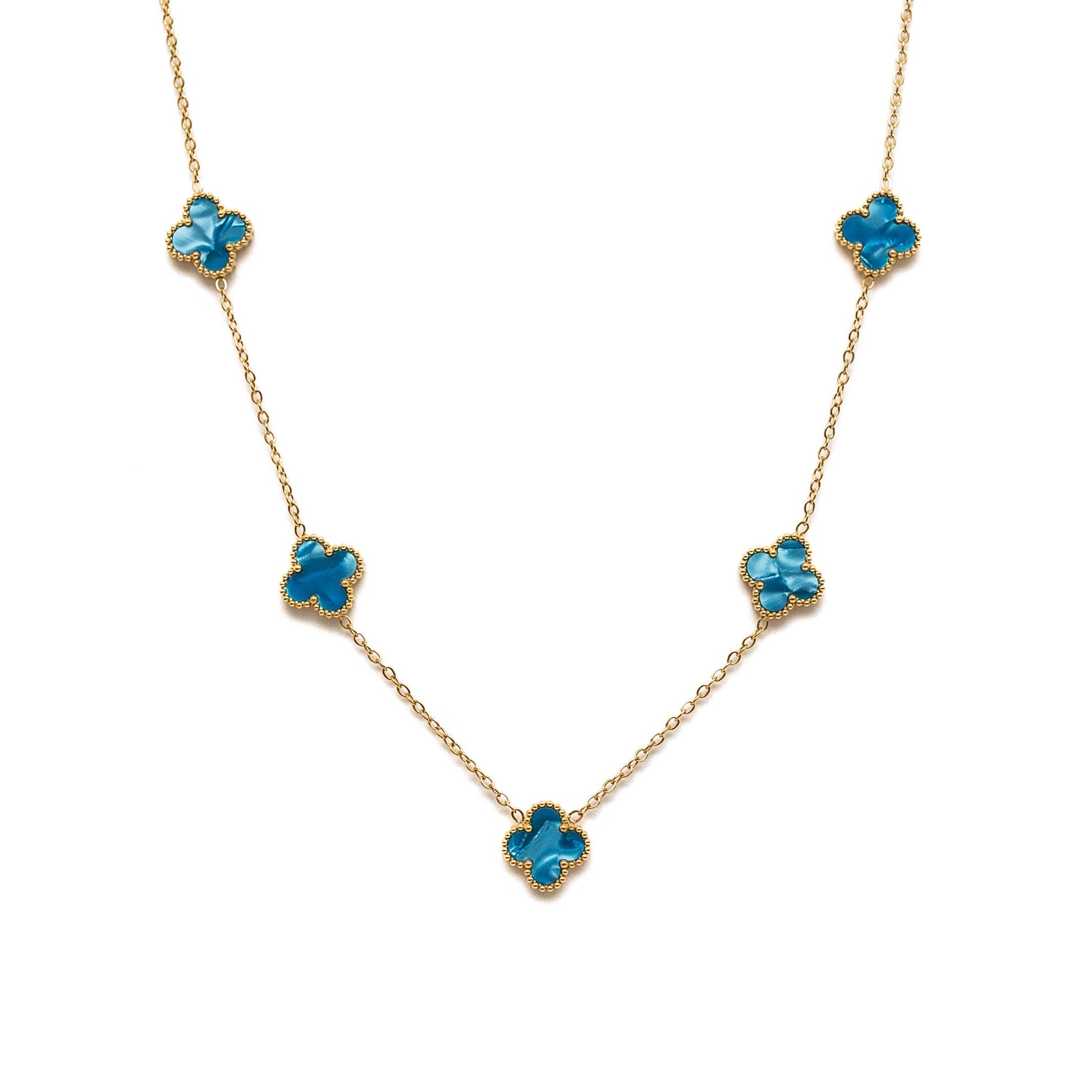 Sparkle and shine with our Gold Pearl Clover Necklace in Blue. This elegant piece features a delicate clover pendant with a lustrous pearl center, set in a stunning gold chain. Make a statement with this lucky charm, perfect for any occasion.