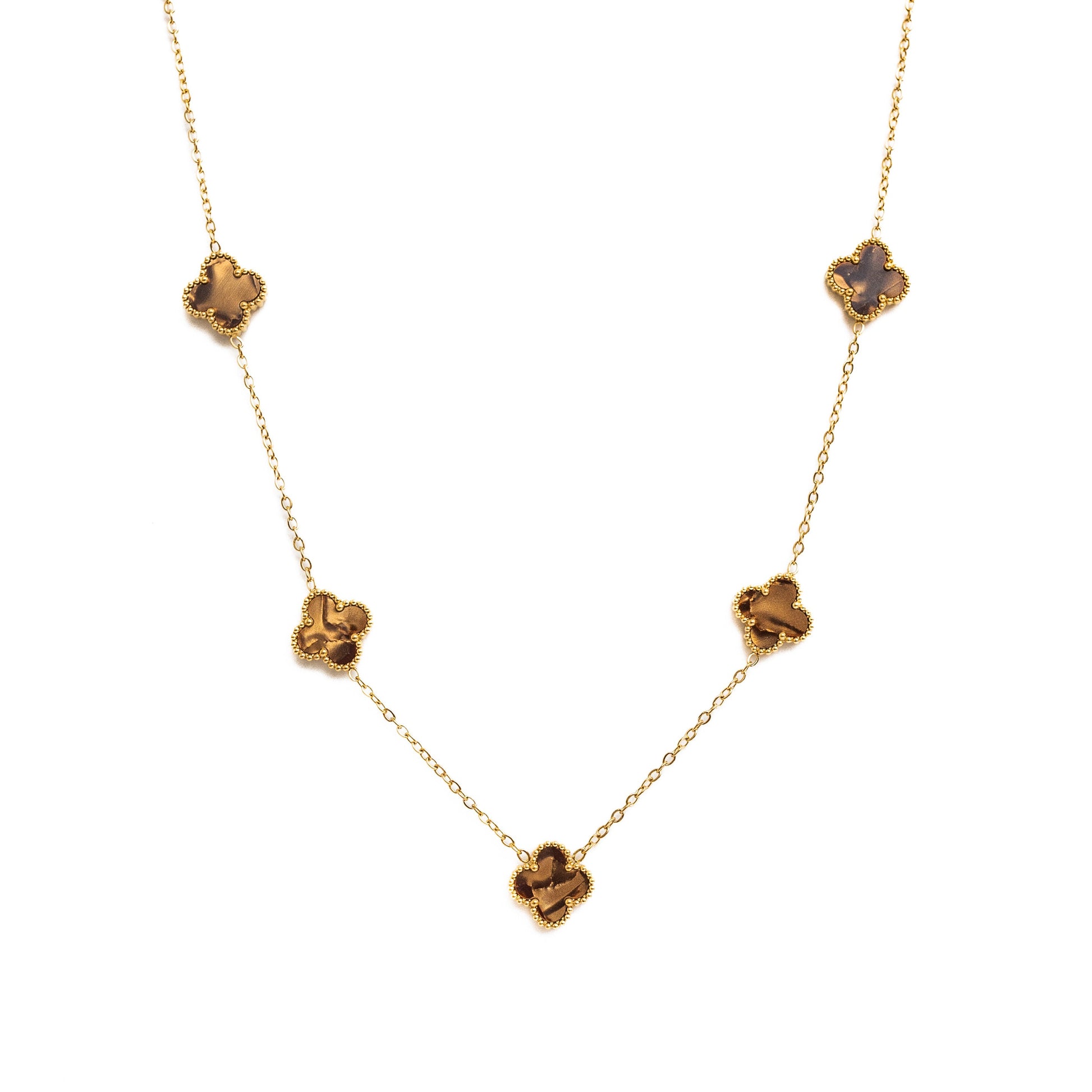 Elevate your style with our Gold Pearl Clover Necklace in Chocolate. This unique piece features a stunning clover pendant adorned with lustrous pearls, adding a touch of elegance to any outfit. Perfect for any occasion, this necklace is sure to become your go-to accessory.