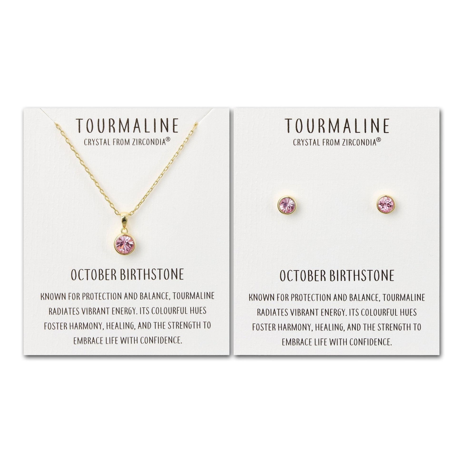 This gold plated October birthstone set features pink Zircondia® crystal pendant and stud earrings. Hypoallergenic and lightweight, it includes a 43cm necklace with extender and secure clasps. Beautifully packaged in a gift pouch with quote cards, it’s an ideal meaningful gift.