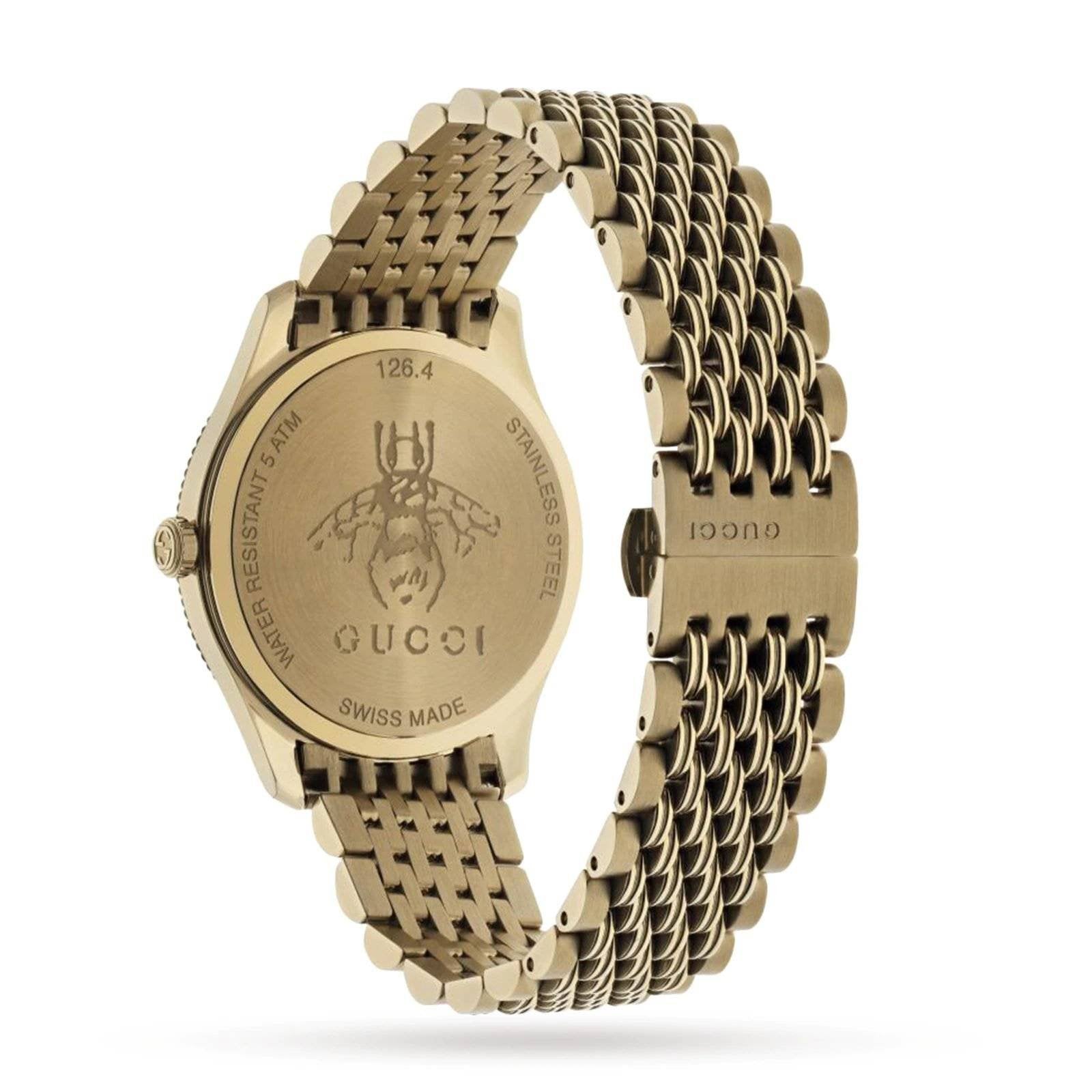 This Ladies Gucci G-Timeless contemporary collection features an elegant 36mm case. Showcases hour markers for an uncomplicated aesthetic and a stunning Silver dial and BEE as seconds hand, all protected by Sapphire crystal glass. This stunning Swiss-made watch is powered by a Quartz movement, offering precise and accurate timekeeping. Presented on a Stainless Steel bracelet and fastened with a deployment clasp for a secure and comfortable fitting on the wrist.