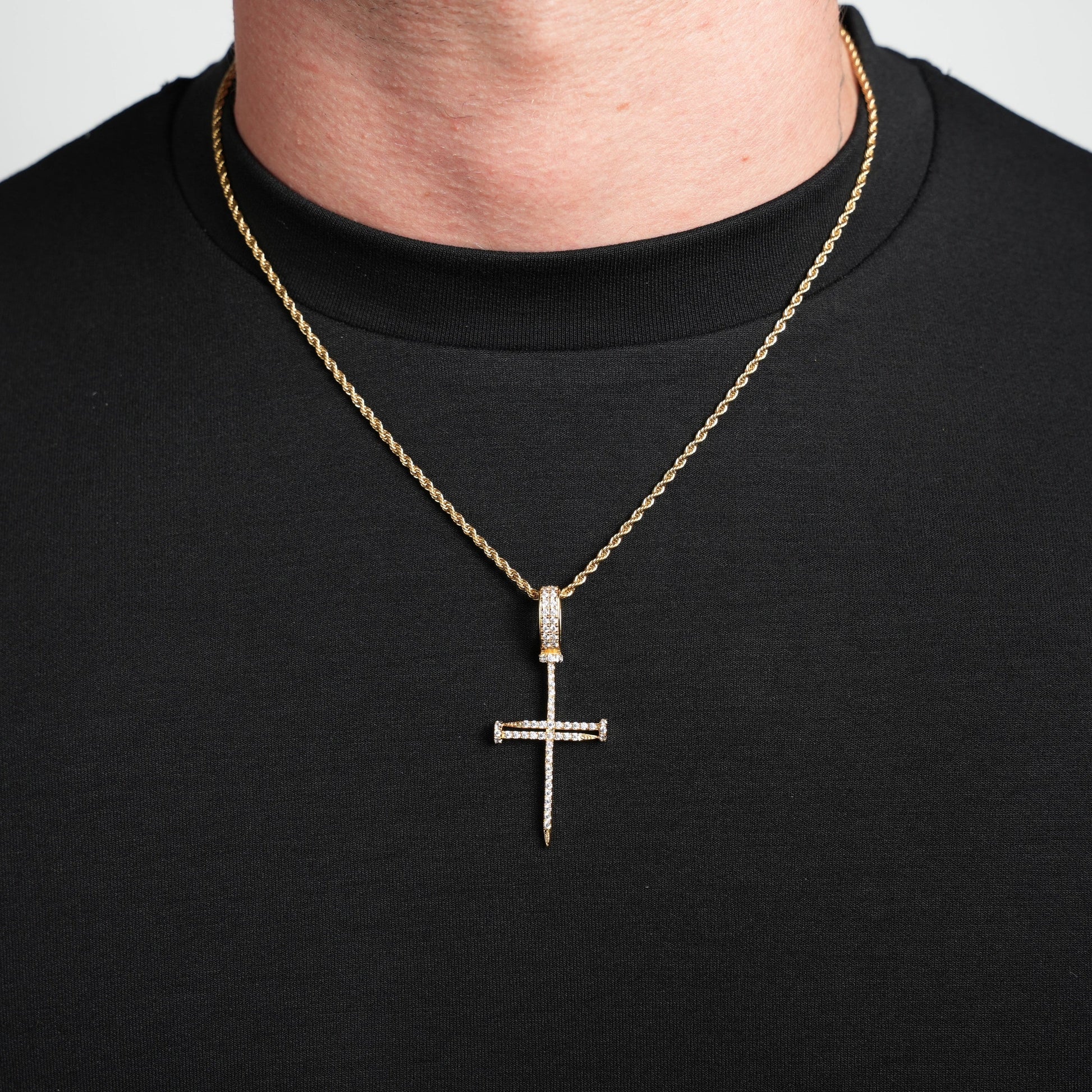 Upgrade your style with our Iced Nail Cross Pendant in elegant gold. The striking design features intricate detailing and sparkling stones, creating a unique and eye-catching appearance. Add a touch of sophistication to any outfit with this stunning accessory.