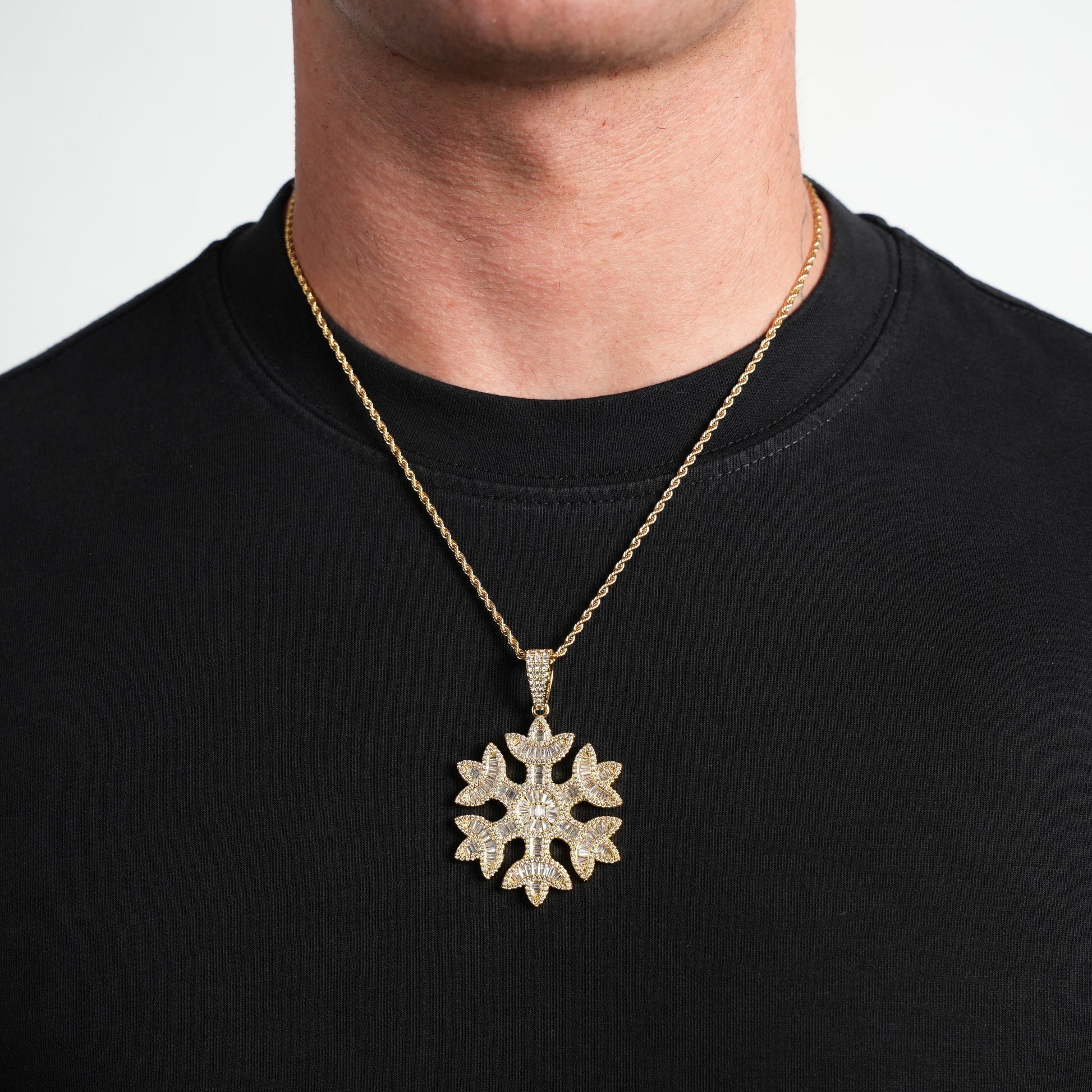 Elevate your winter style with our Iced Snowflake Pendant in Gold. The intricate snowflake design is adorned with dazzling diamonds, adding a touch of sparkle to any outfit. Perfect for the holiday season or any winter occasion, this pendant is sure to make a statement.