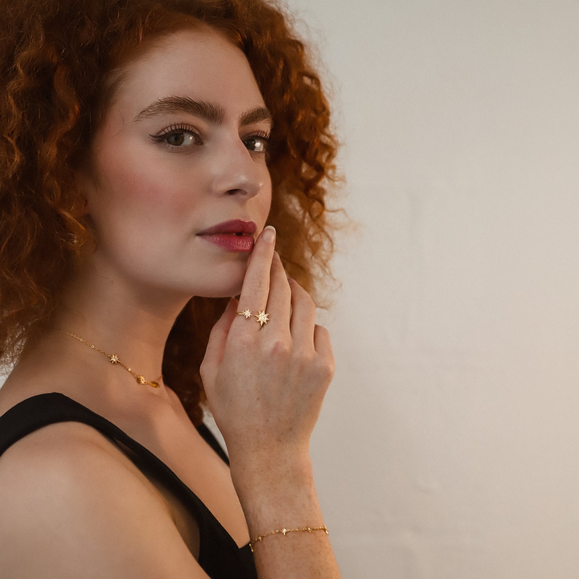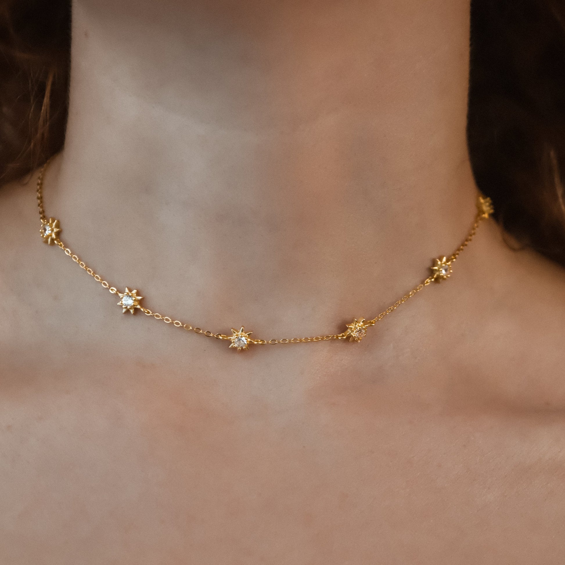 Minimal and dainty, yet keeping the signature Luna Charles celestial style. The Icelyn Necklace is crafted in 18 carat gold plated silver, a choker style fit with a delicate chain interrupted by northern stars, encrusted with tiny sparkling stones. Perfect on her own or to style as a layering look.