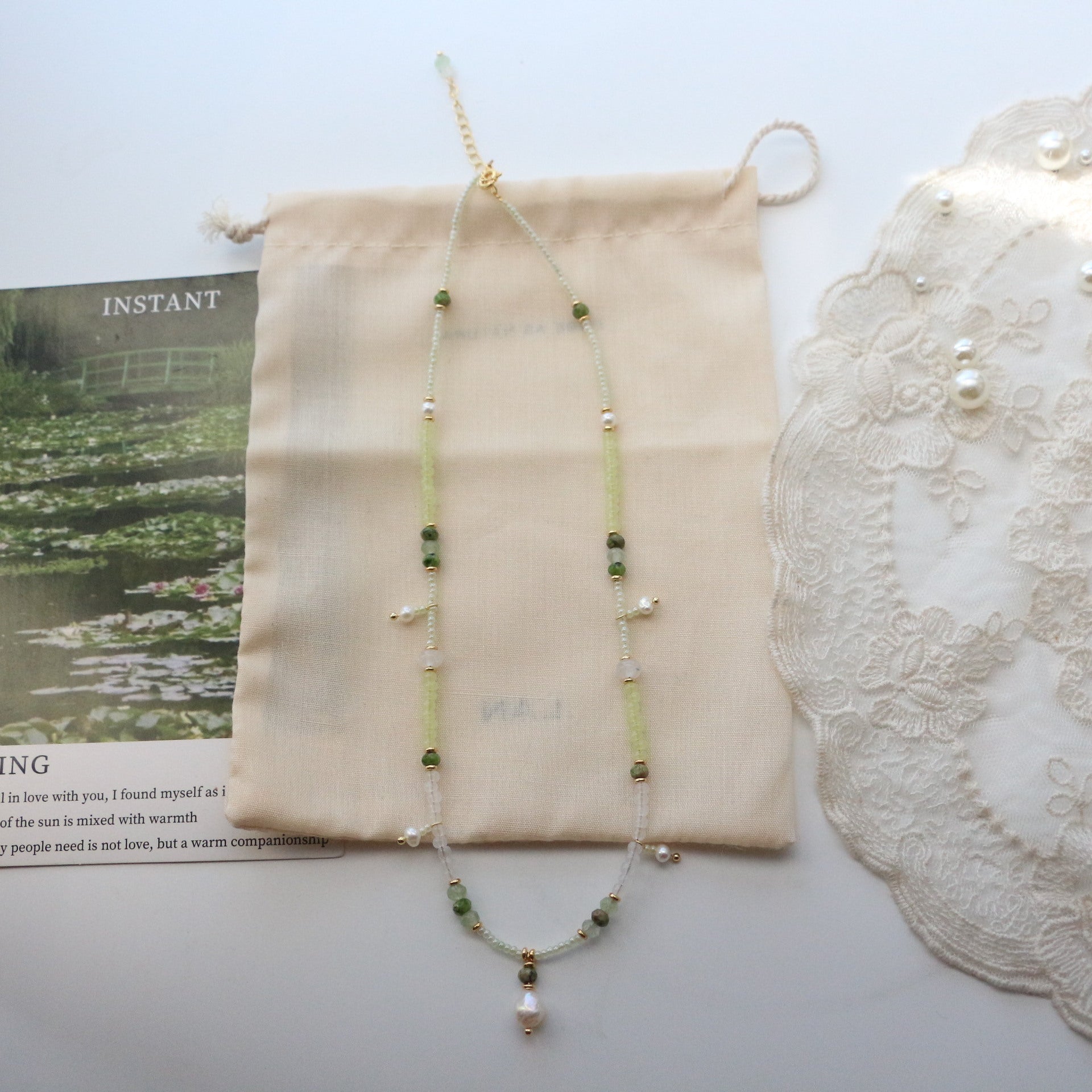 Design: A delicate chain of 6mm freshwater baroque pearls alternated with green gemstone chips (e.g., chrysoprase or peridot) and 2mm crystal rice beads, centered by a pearl-and-gemstone pendant on a copper-plated 18K gold bail.