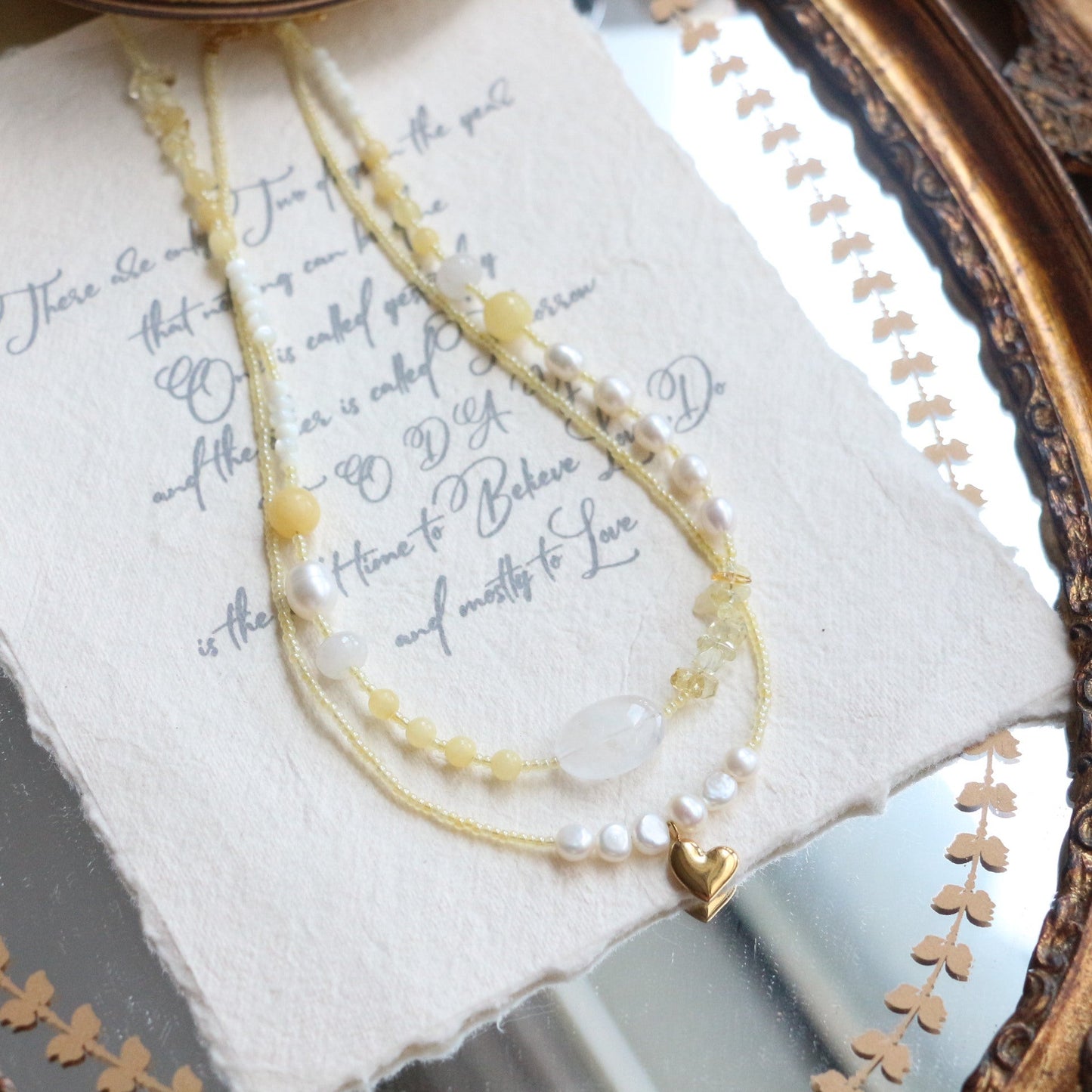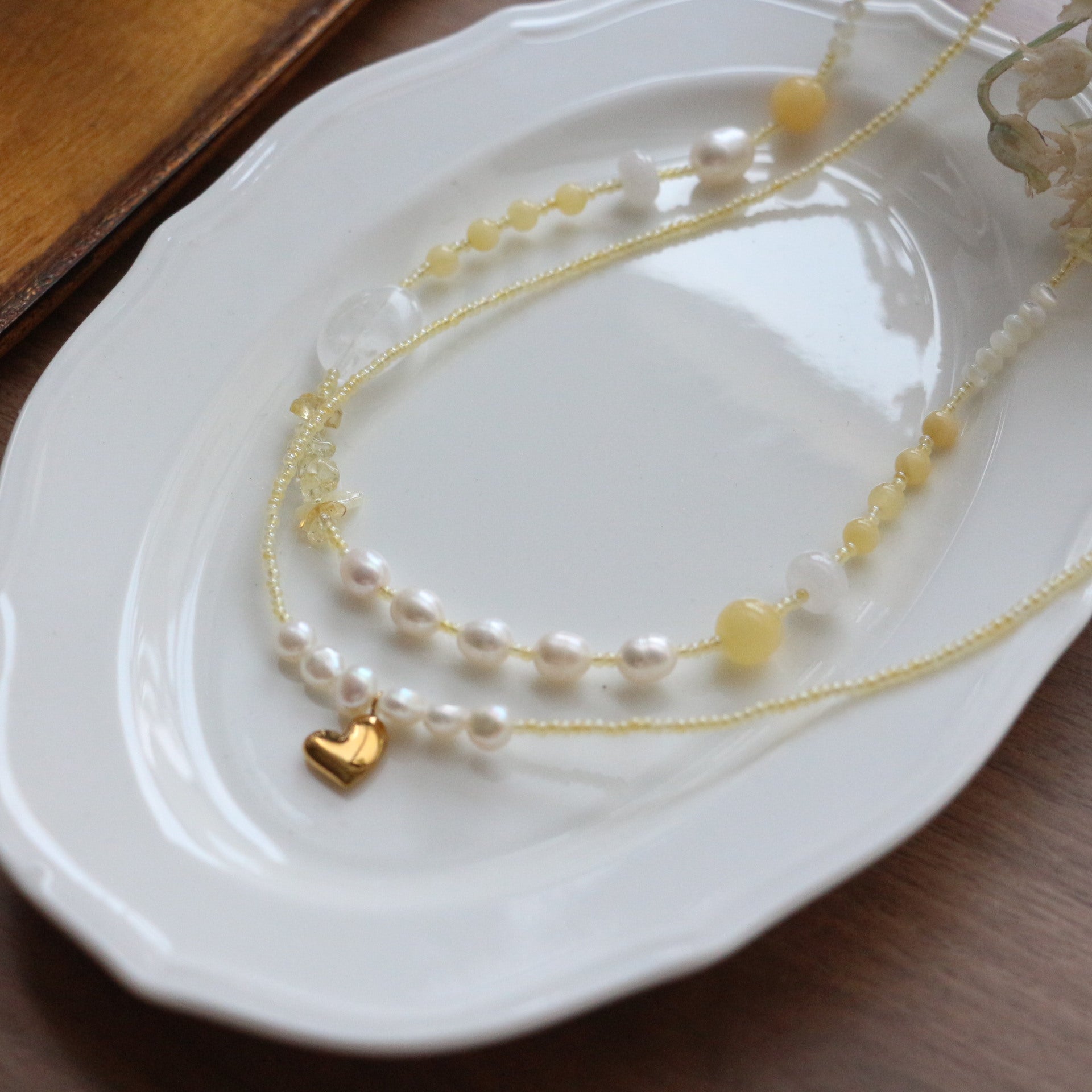 Design: A dainty chain of white crystal rice beads and citrine chips, centered by a copper-plated 18K gold heart pendant inlaid with a miniature baroque pearl, symbolizing love and individuality.