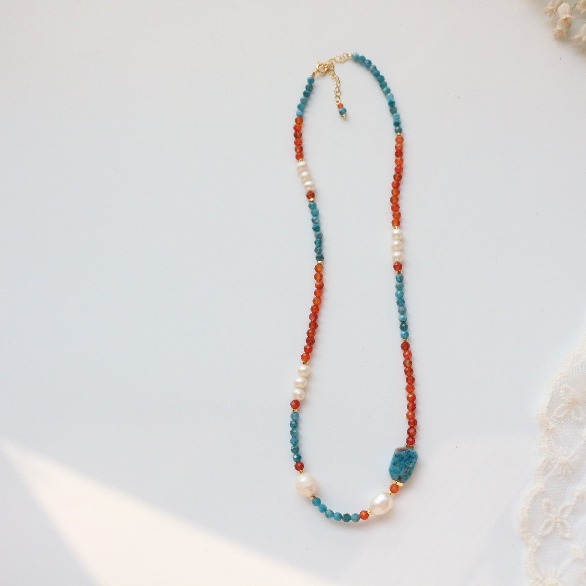 Sky & Earth: Double-row design with apatite rondelles and irregular Baroque pearls, accented by miniature carnelian spacers. Detachable pearl tassel for modular styling.