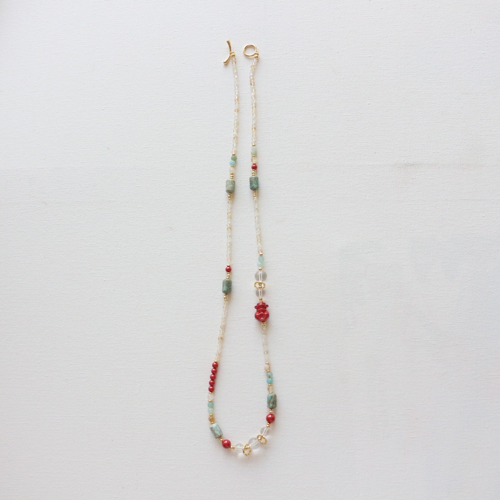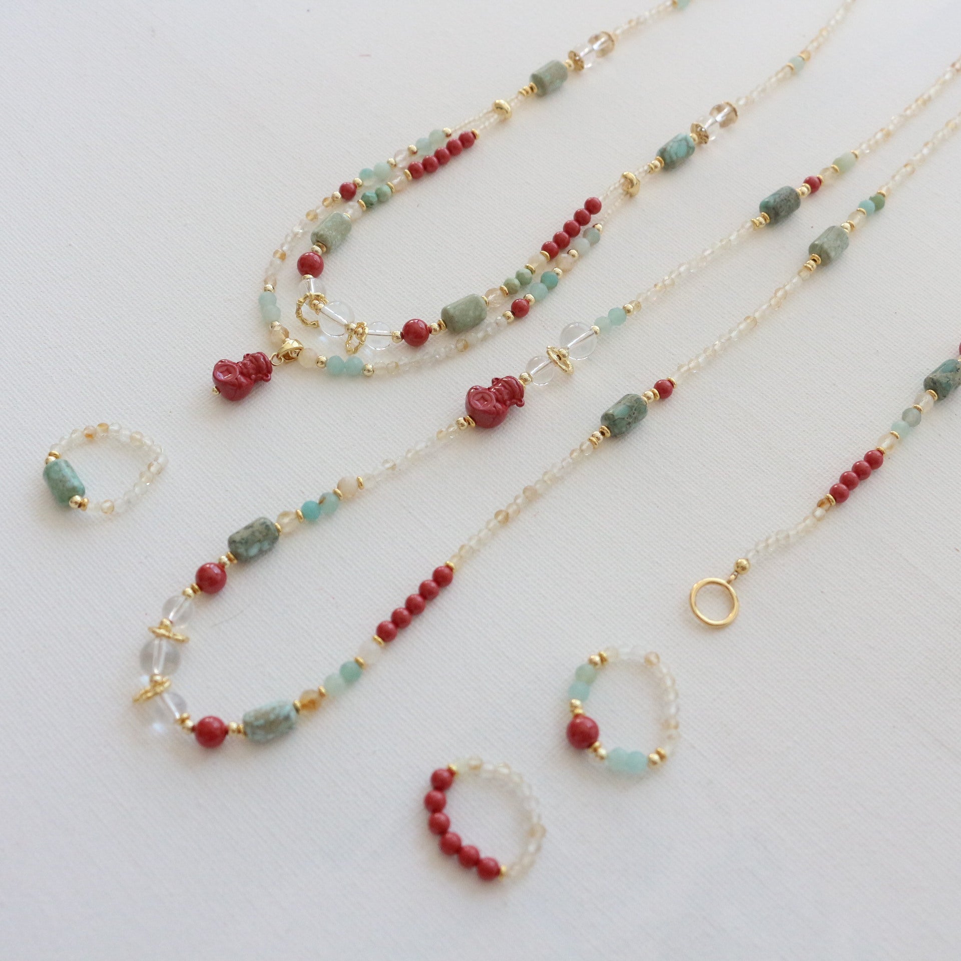Design: Two layered chains – a shorter turquoise and citrine strand paired with a longer red gemstone strand – for dimensional bohemian elegance.