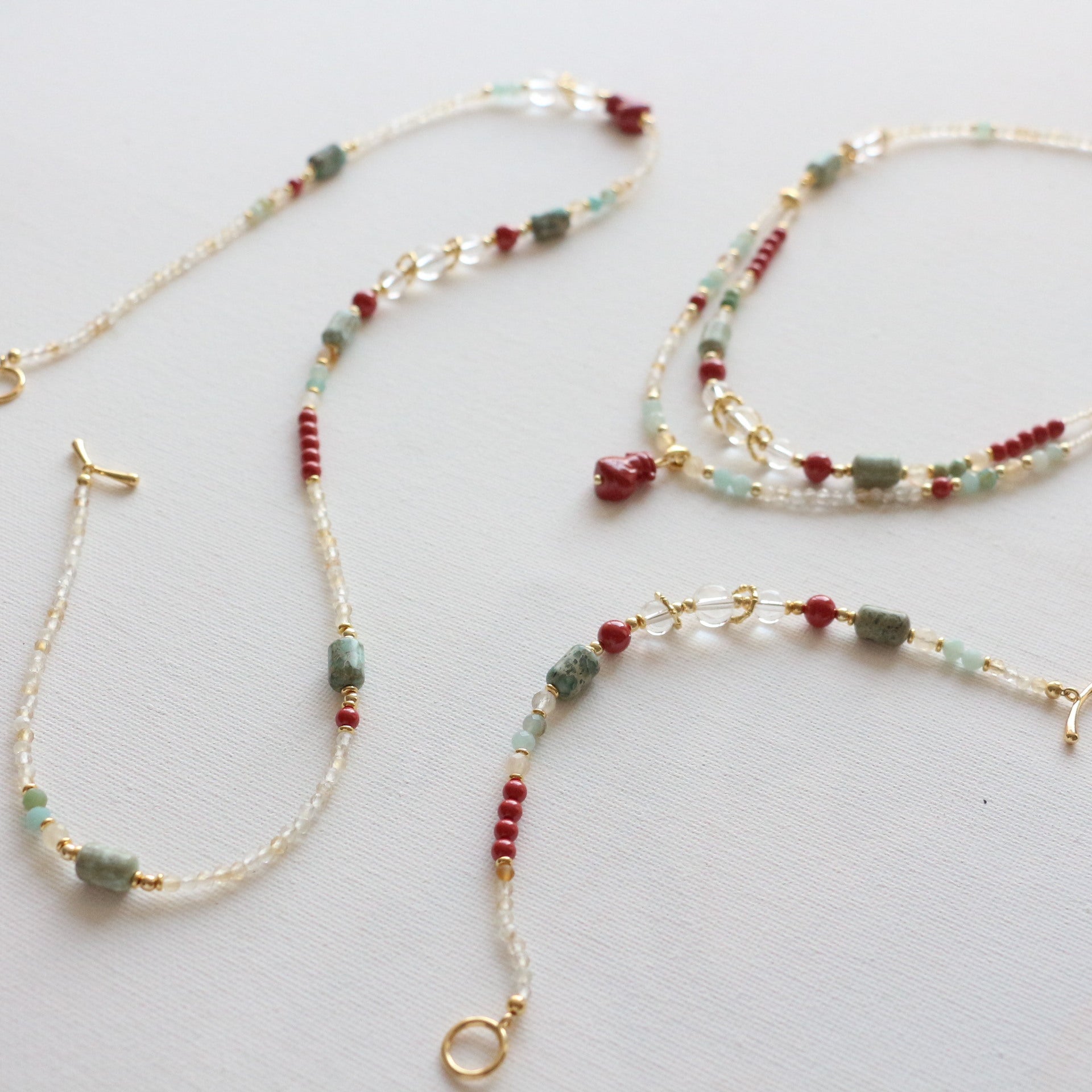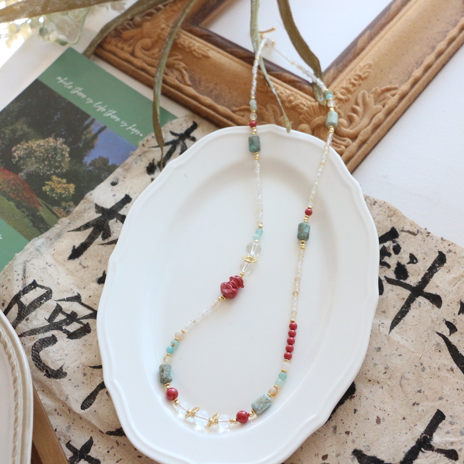 Design: Alternating red gemstones, citrine, and turquoise beads on a copper-plated 18K gold chain, secured with a sliding knot to fit wrists up to 16cm.