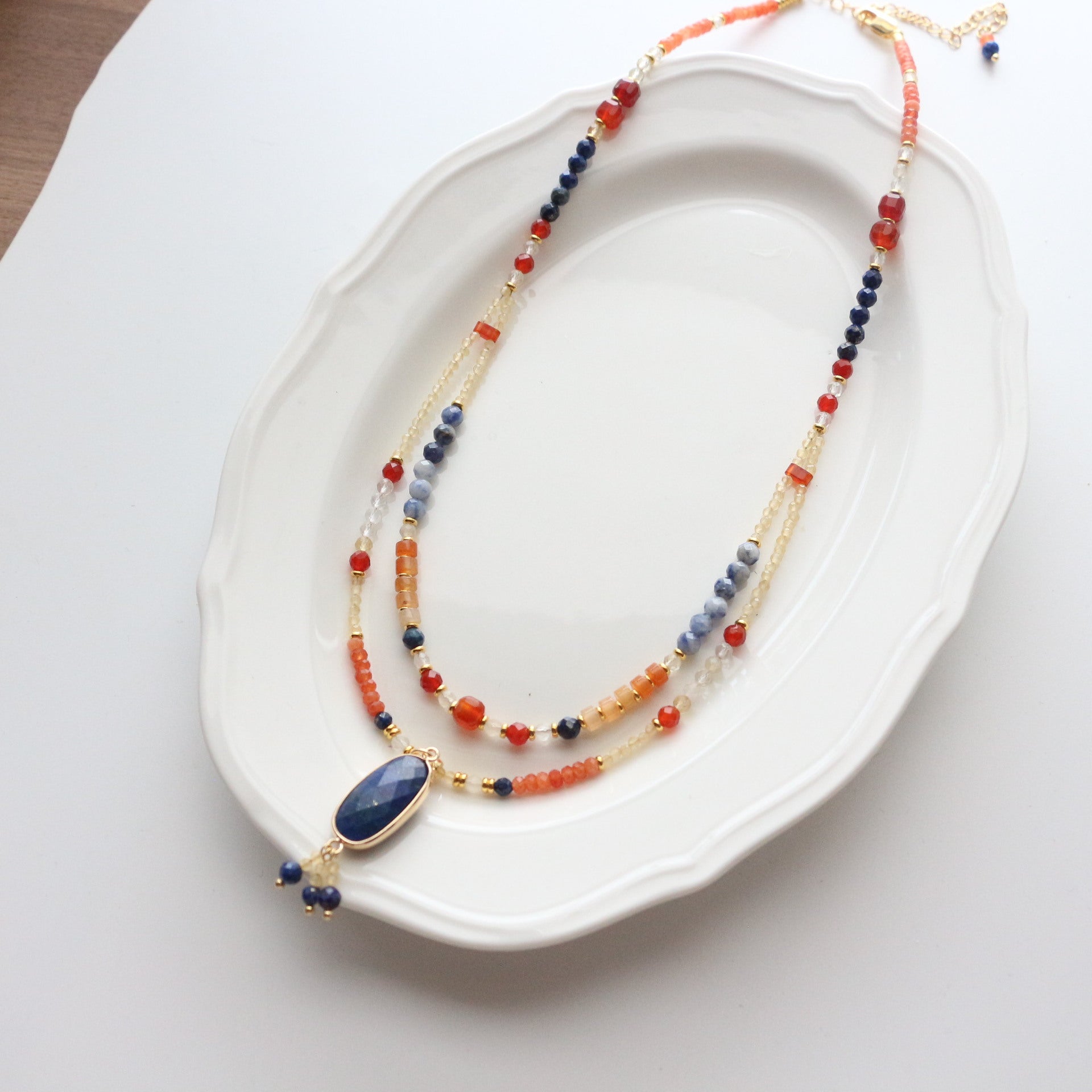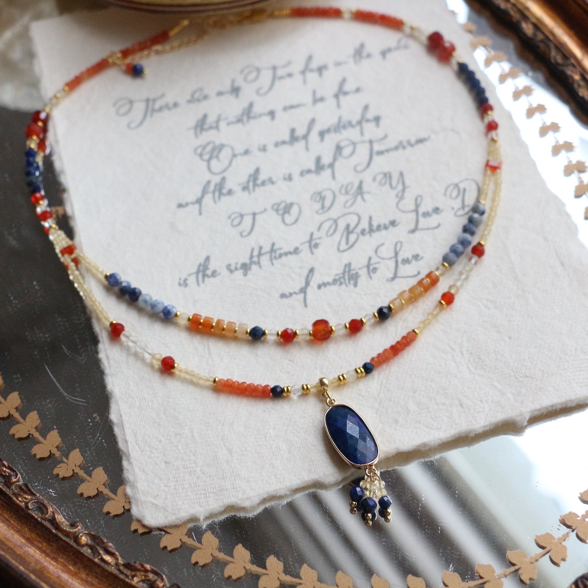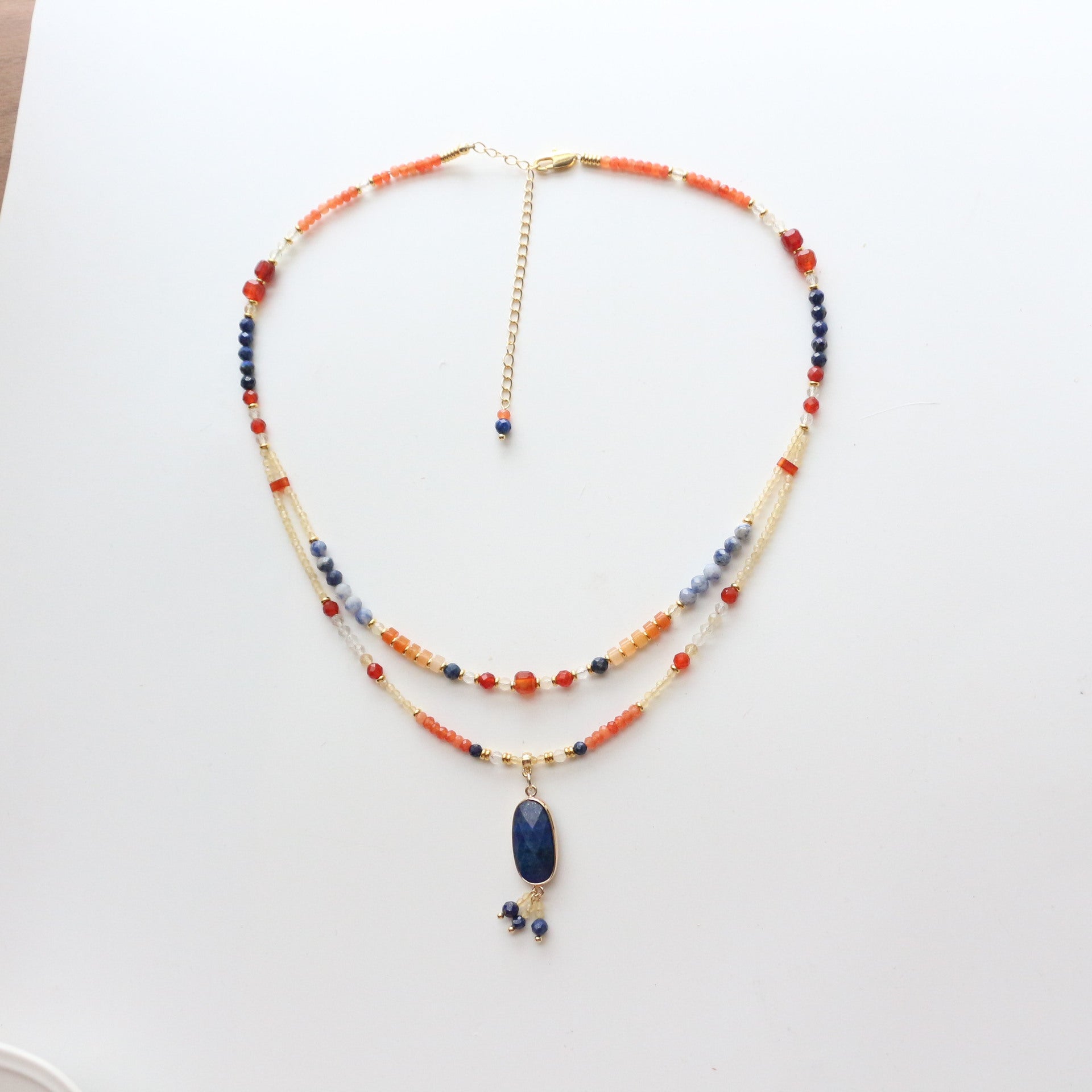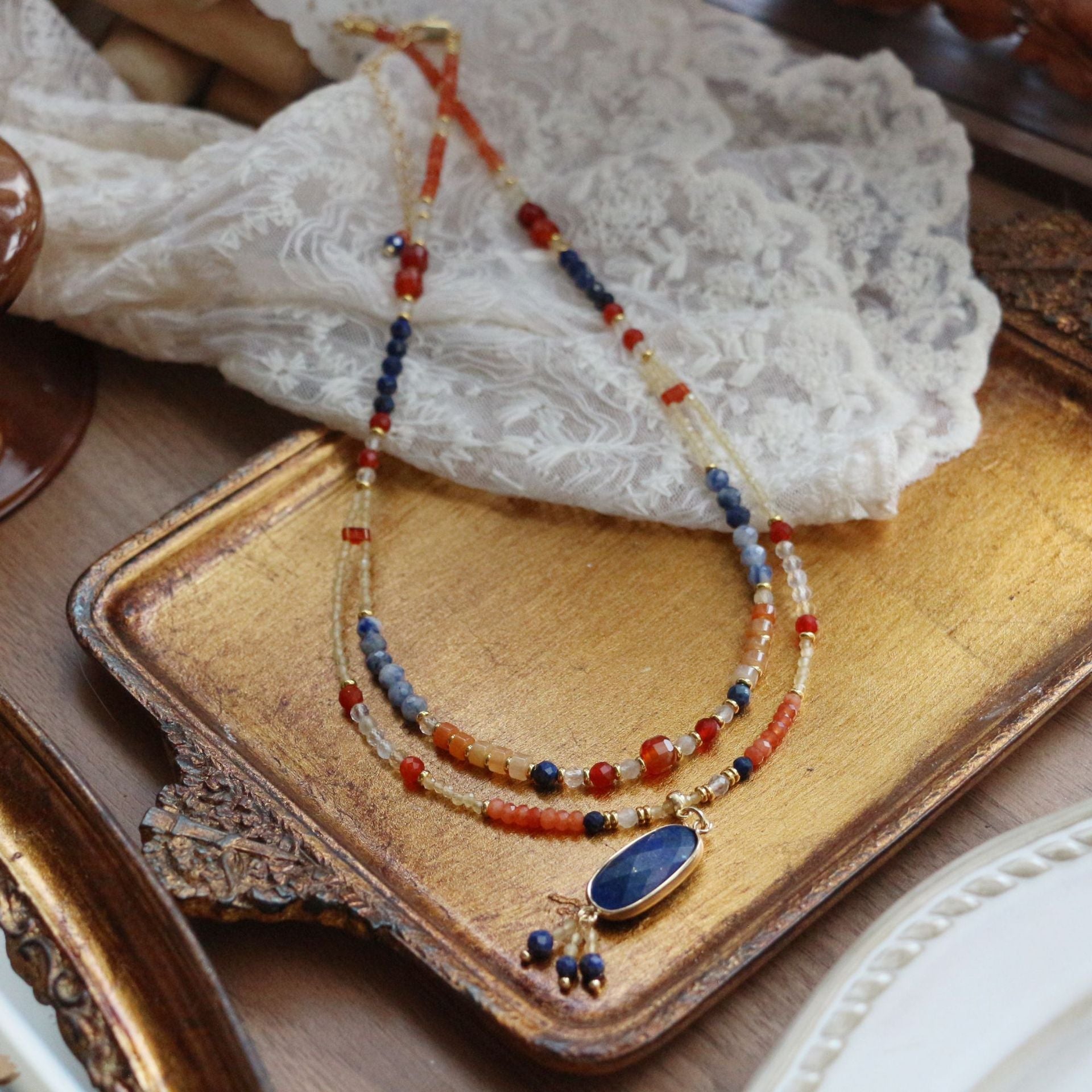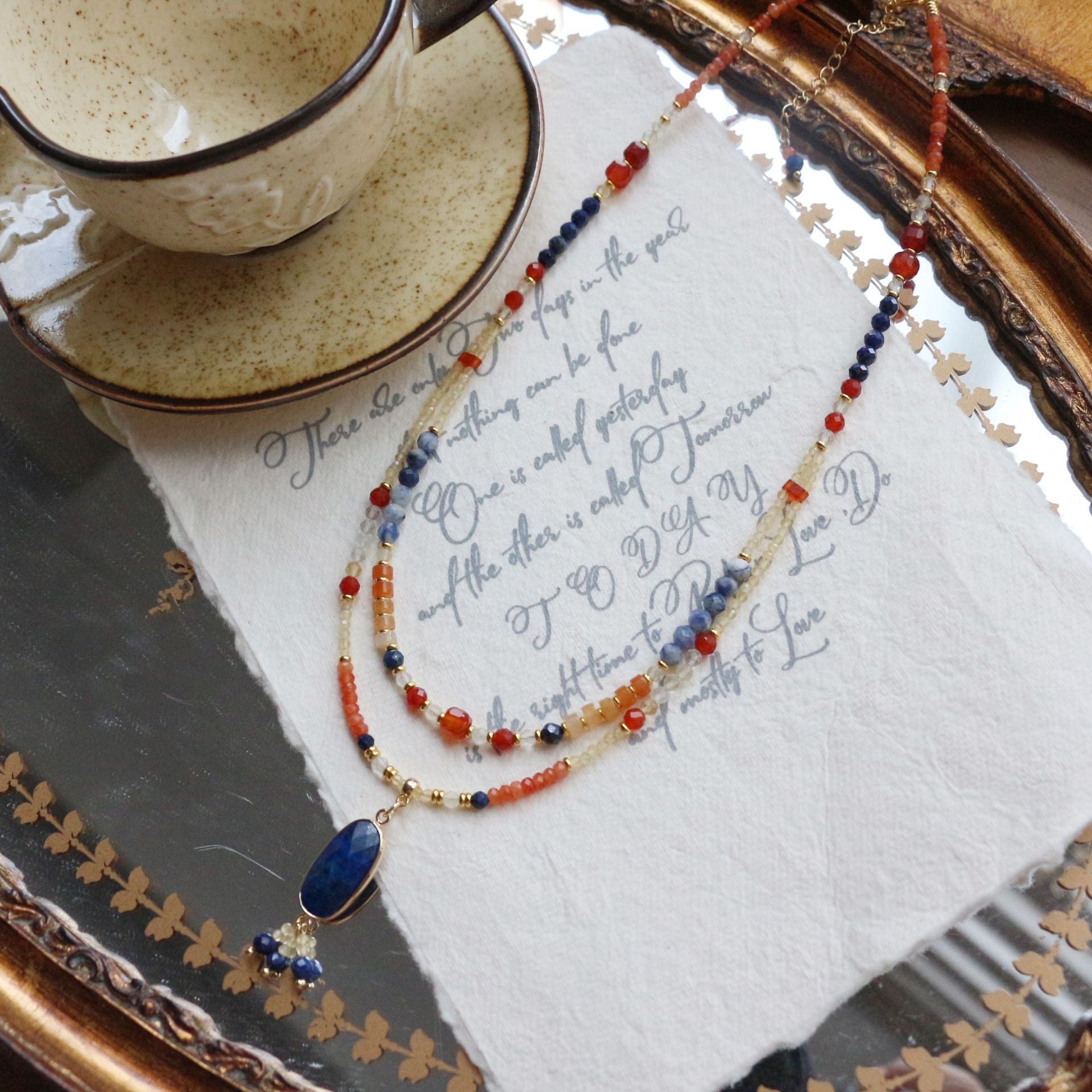 Design: A statement piece combining a shorter strand of lapis lazuli and red agate beads with a longer strand featuring lapis lazuli, crystals, and a central lapis lazuli pendant.
