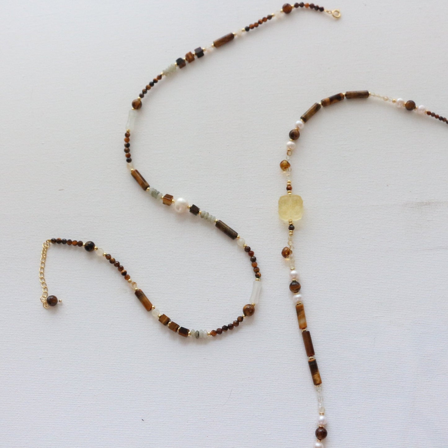 Channel the warmth of autumn’s Maillard palette with Jekira’s handcrafted jewelry set, blending golden tiger’s eye (courage), citrine (abundance), and freshwater baroque pearls (organic elegance) in a symphony of earthy tones. This adjustable duo offers versatile styling for lovers of bohemian sophistication and symbolic adornment.