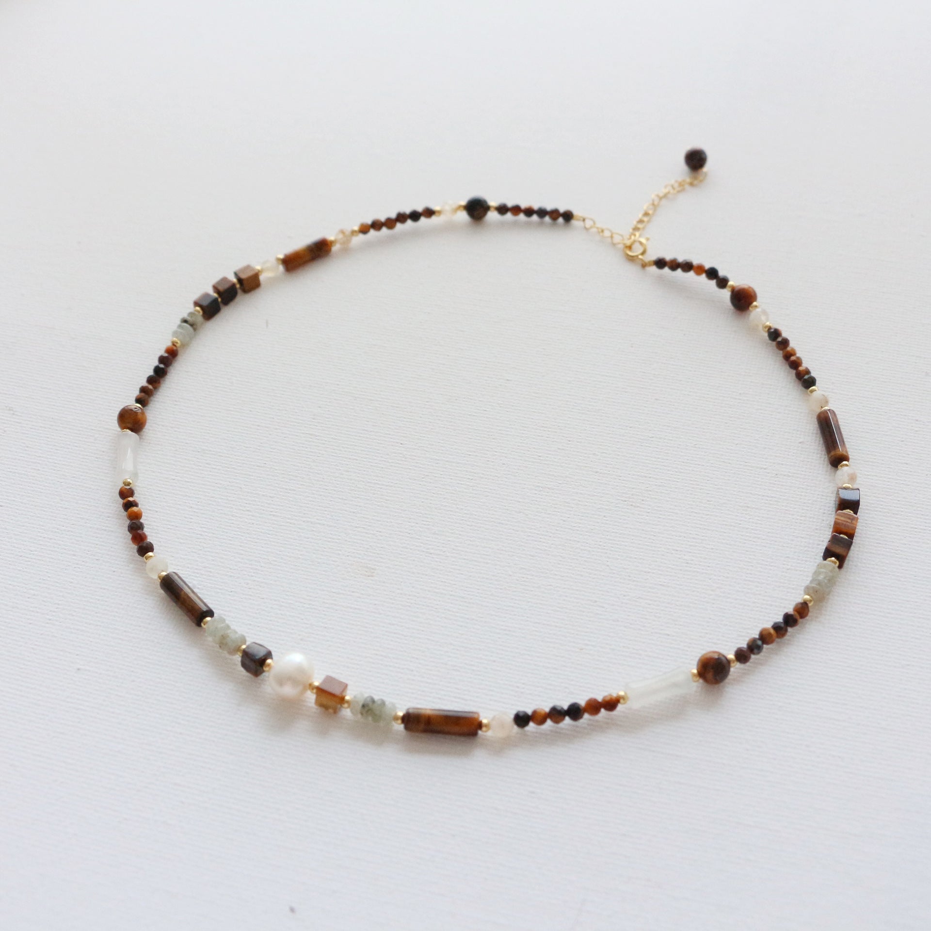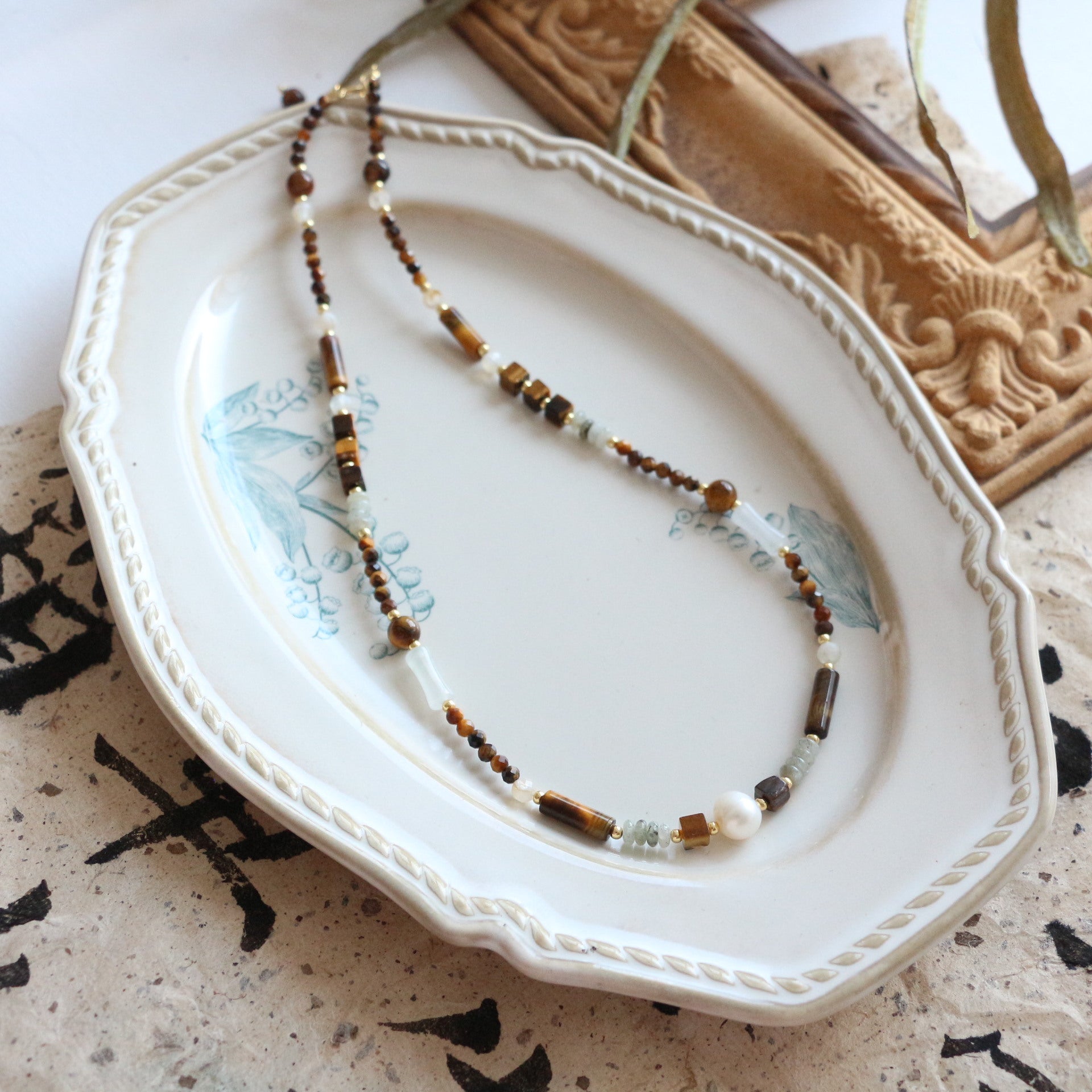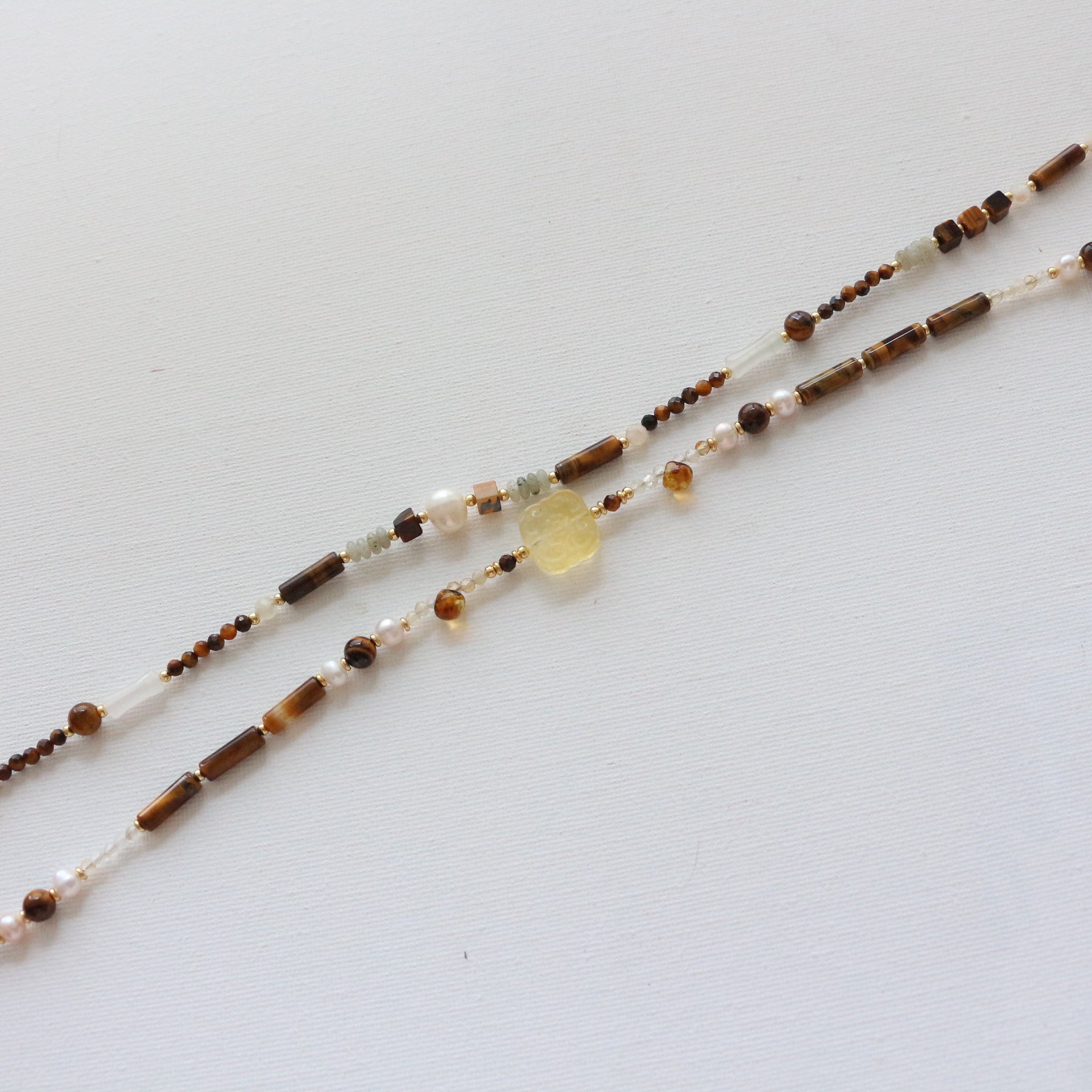 Design: A bold strand of natural tiger’s eye beads paired with amber-toned Czech glass beads, evoking caramelized warmth.
