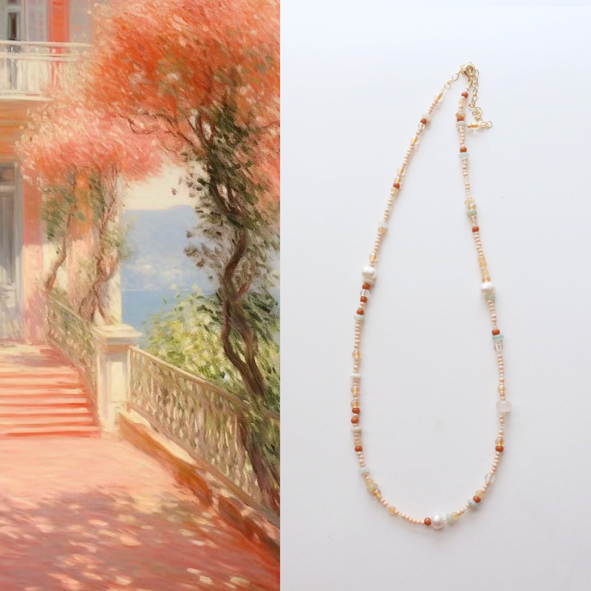 A harmonious mix of gradient-hued gemstones (e.g., amethyst, rose quartz, citrine) and sparkling crystals, interspersed with organic freshwater Baroque pearls. Finished with a copper-plated 18K gold clasp for effortless styling.