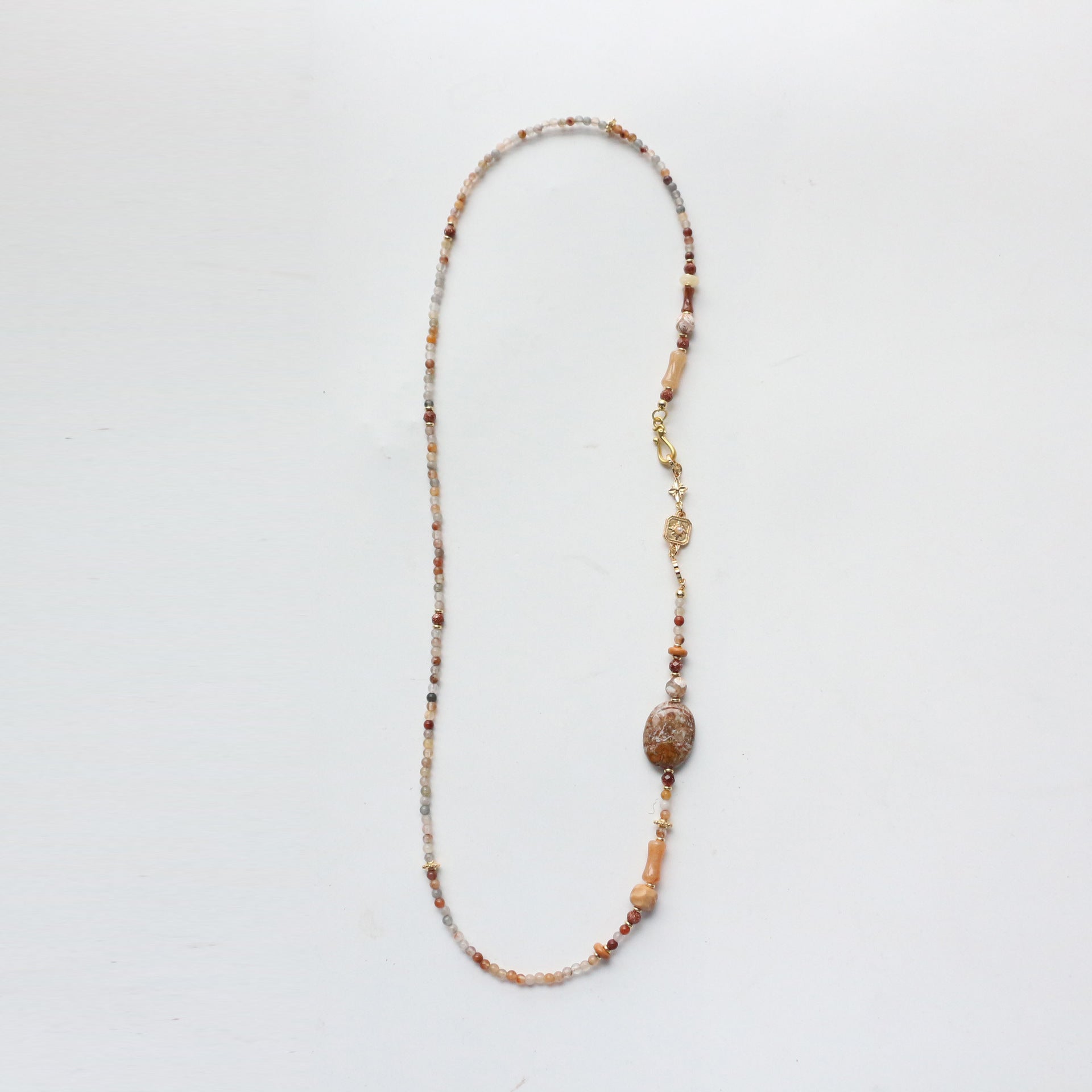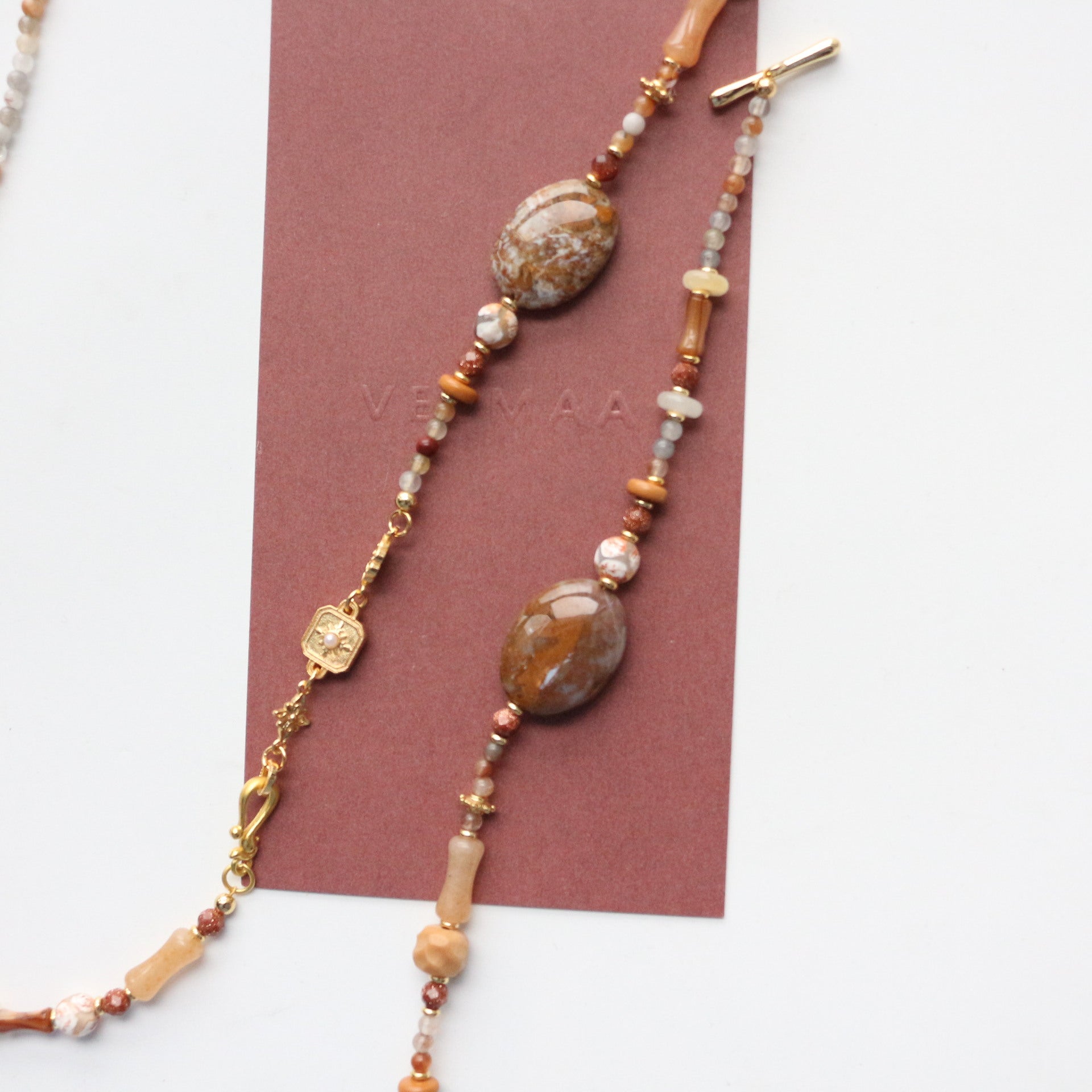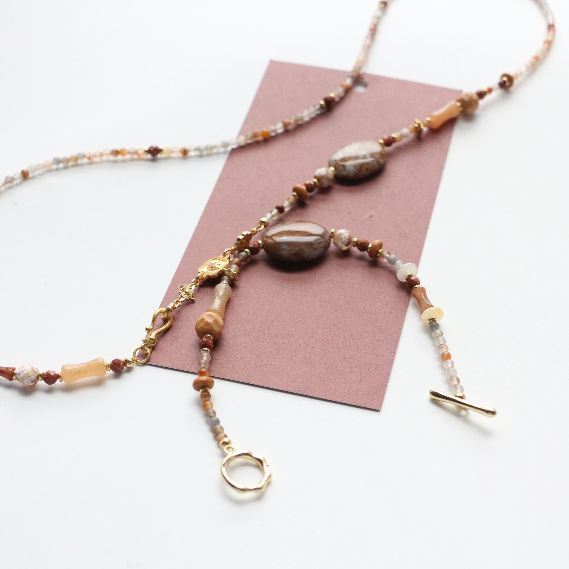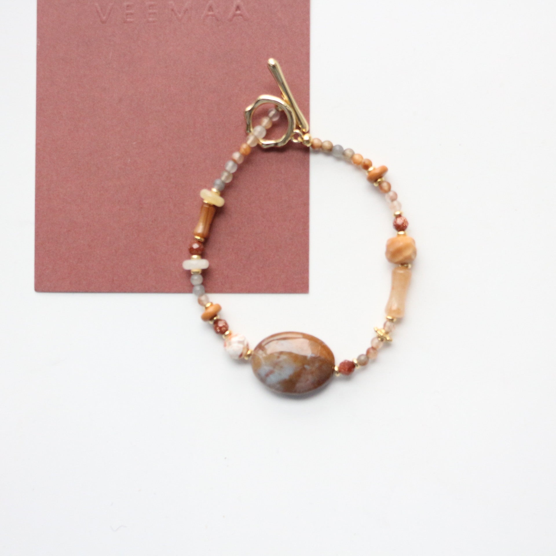 Features miniature natural stone beads and Moroccan agate charms, strung on a flexible copper-plated 18K gold chain with an extendable OT clasp (fits wrists 14-16cm).