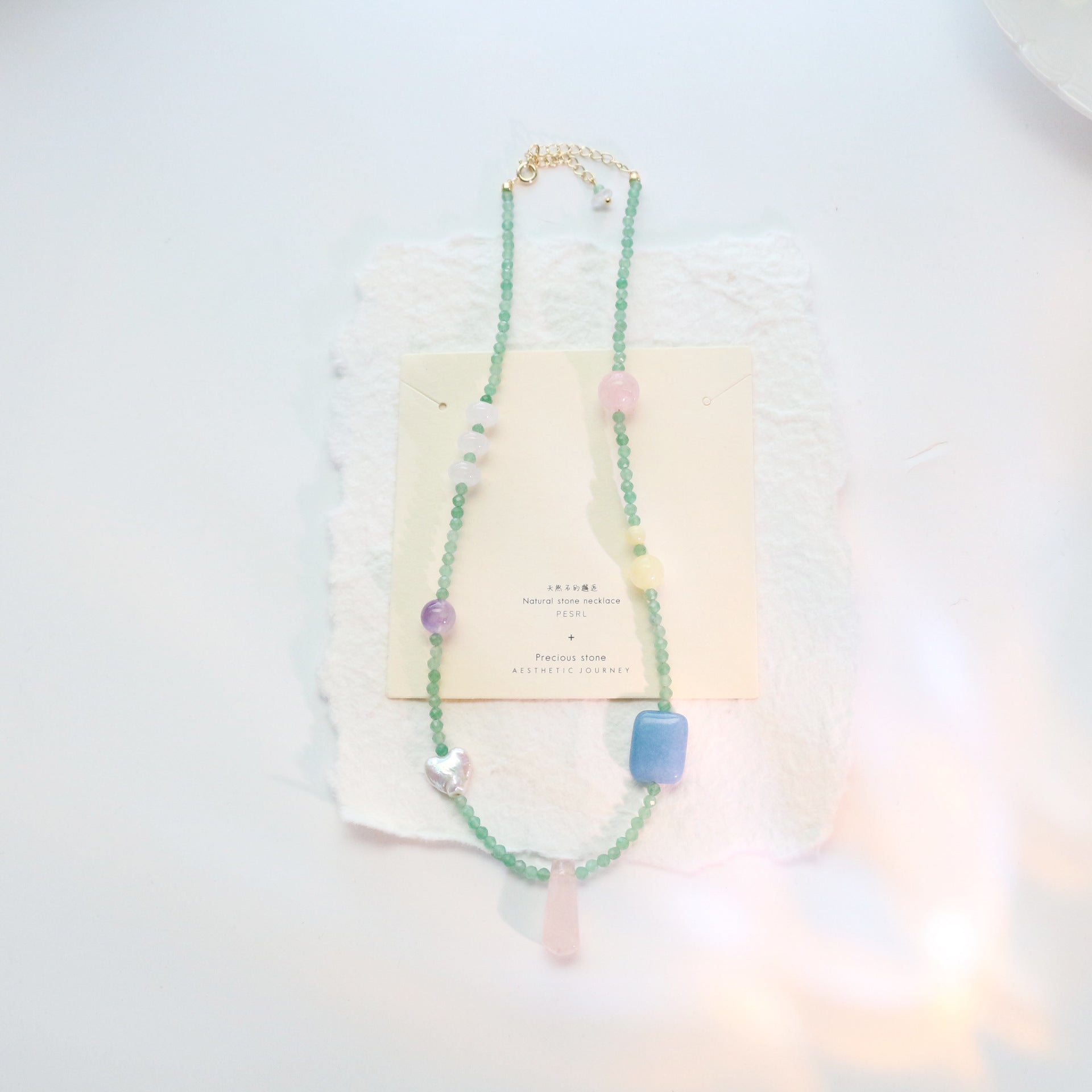 Stones: Natural green gemstone, freshwater baroque pearls, agate, clear quartz, amethyst