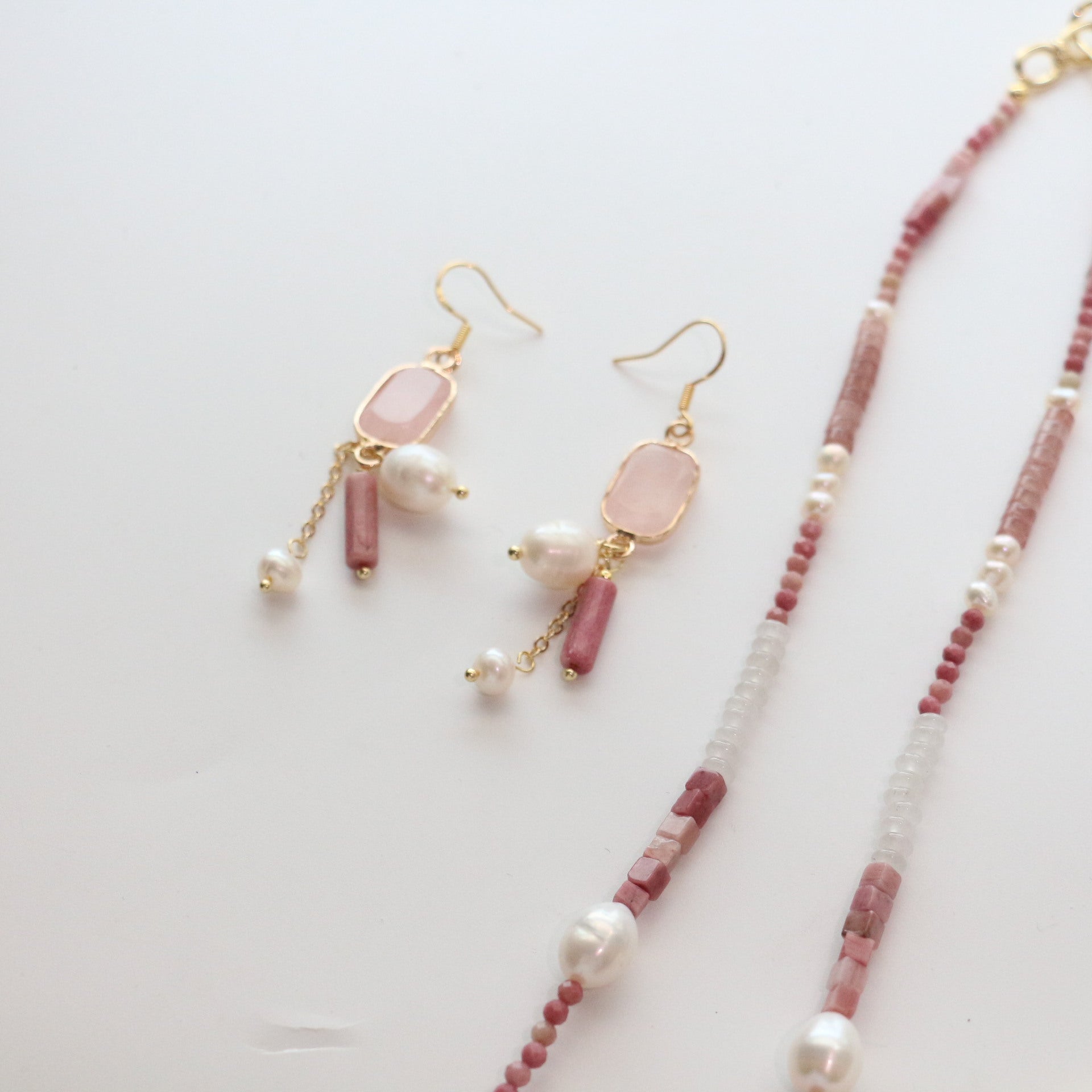Jekira Rhodonite & Rose Quartz Healing Set (47cm Necklace + 925 Silver Earrings)