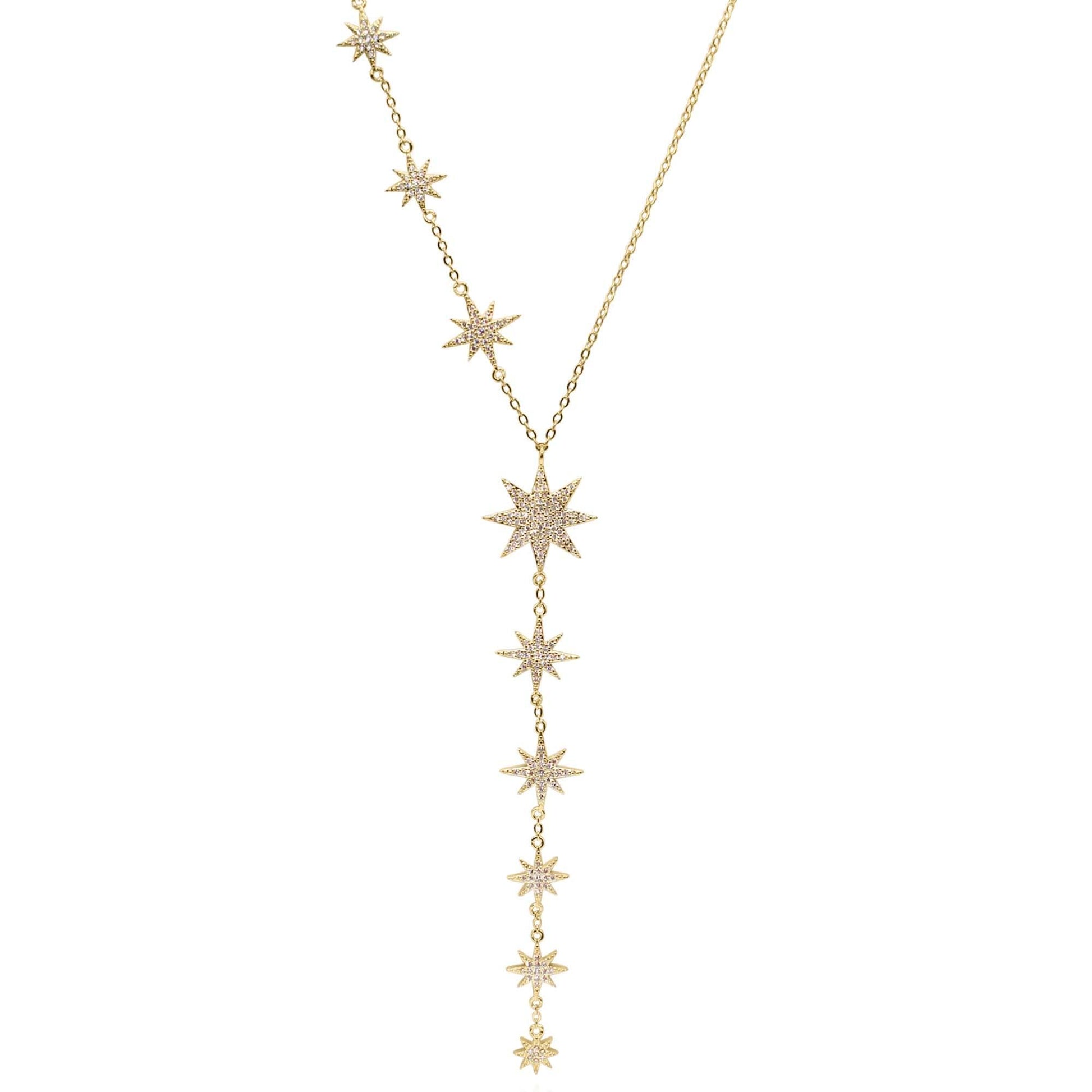 The Juliet is a gorgeous gold plated Y shape drop style necklace with a galaxy of sparkling starbursts encrusted with pave crystals. No one will be able to keep their eyes off this one.
